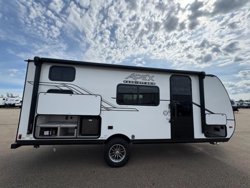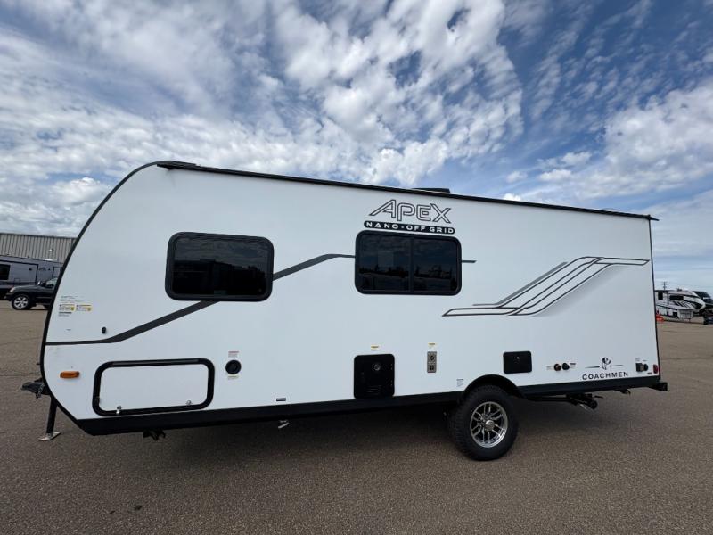 You will find comfort, convenience, and a sturdy construction with each of these Coachmen RV Apex Nano travel trailers! They are held together with an aluma-cage construction, an I-beam chassis, plus vacuum-bonded laminated dual Azdel fiberglass walls for double the protection against the elements. The 200-watt solar panel with a 30 amp control charger is included within the Off-Grid Package, along with two 20 lb. LP tanks, a high velocity power roof vent, plus 12V outlets to keep you powered up. More exterior feature include a hot/cold shower, four stabilizer jacks, a power awning with LED lighting, and magnetic baggage door catches to easily pack and unload your gear. You will love the interior of your Apex Nano with Congoleum residential flooring, one-piece seamless edge countertops, matte black hardware in the galley, and a hand-crafted wood medicine cabinet in the bath.