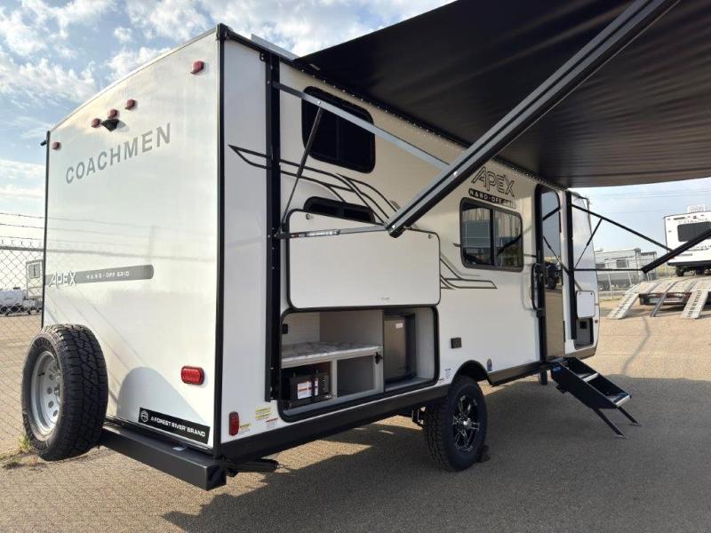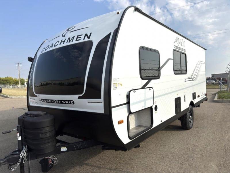 You will find comfort, convenience, and a sturdy construction with each of these Coachmen RV Apex Nano travel trailers! They are held together with an aluma-cage construction, an I-beam chassis, plus vacuum-bonded laminated dual Azdel fiberglass walls for double the protection against the elements. The 200-watt solar panel with a 30 amp control charger is included within the Off-Grid Package, along with two 20 lb. LP tanks, a high velocity power roof vent, plus 12V outlets to keep you powered up. More exterior feature include a hot/cold shower, four stabilizer jacks, a power awning with LED lighting, and magnetic baggage door catches to easily pack and unload your gear. You will love the interior of your Apex Nano with Congoleum residential flooring, one-piece seamless edge countertops, matte black hardware in the galley, and a hand-crafted wood medicine cabinet in the bath.