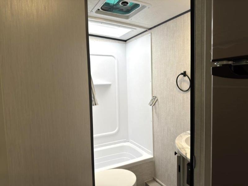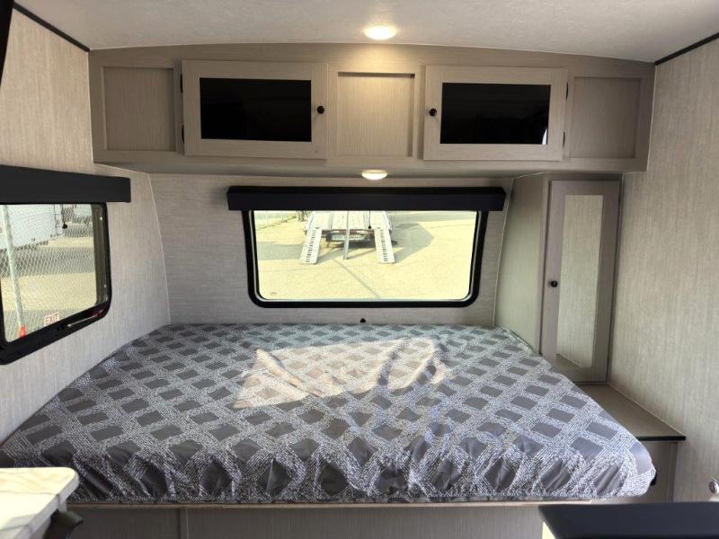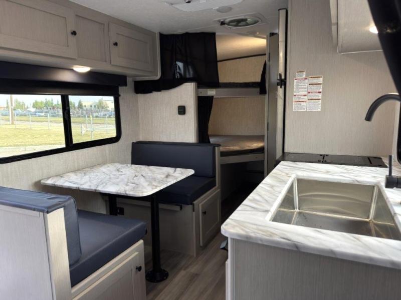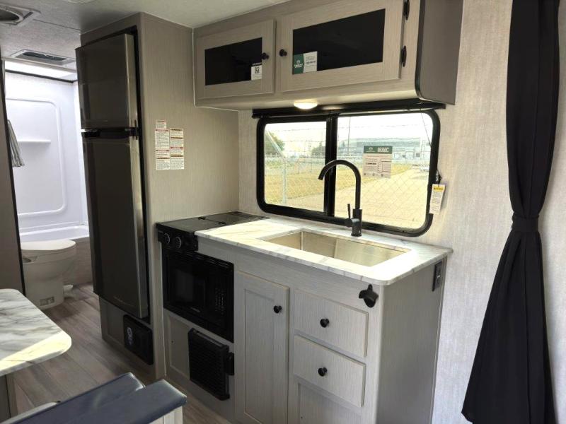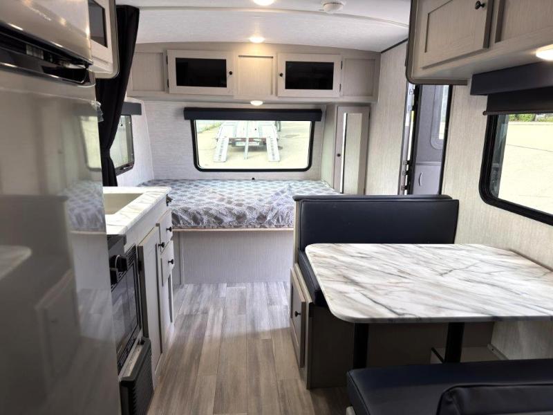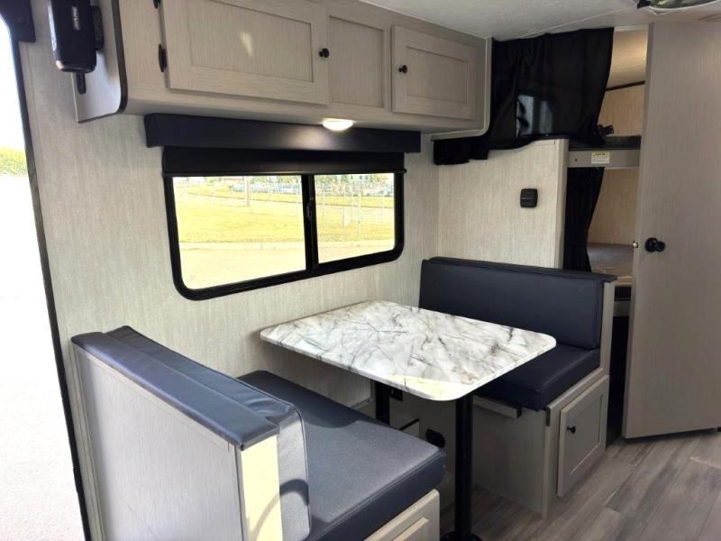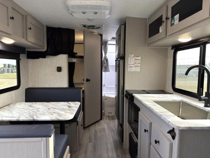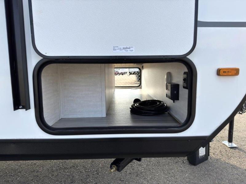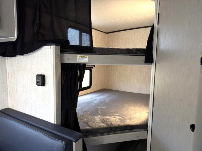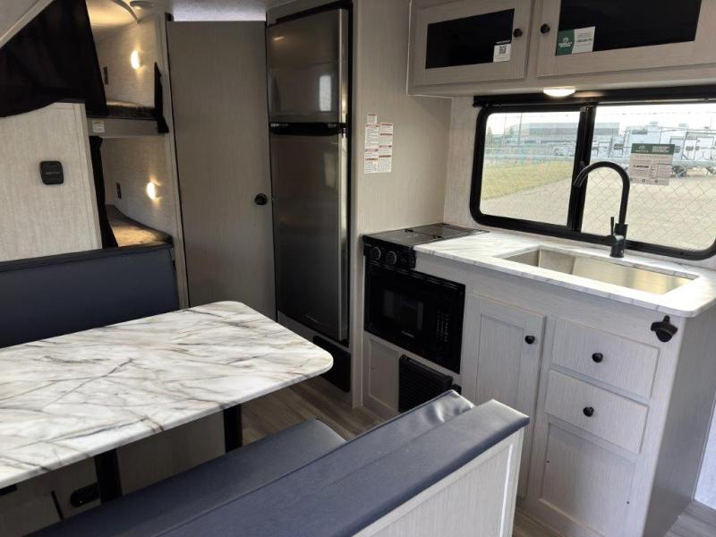 This travel trailer offers versatility with a front fixed bed or optional Murphy bed depending on your needs. There is a rear corner double bed bunk above a lower flip up double bed and a booth dinette that can transform into an extra sleeping space when you're not using it to enjoy a meal or play a card game. Everyone can stay clean with tub/shower in the rear corner bathroom and keep their bellies full with the two burner cooktop and 8 cu. ft. 12V refrigerator. You can even cook outdoors with the exterior camp kitchen while staying protected by the power awning with LED lighting!