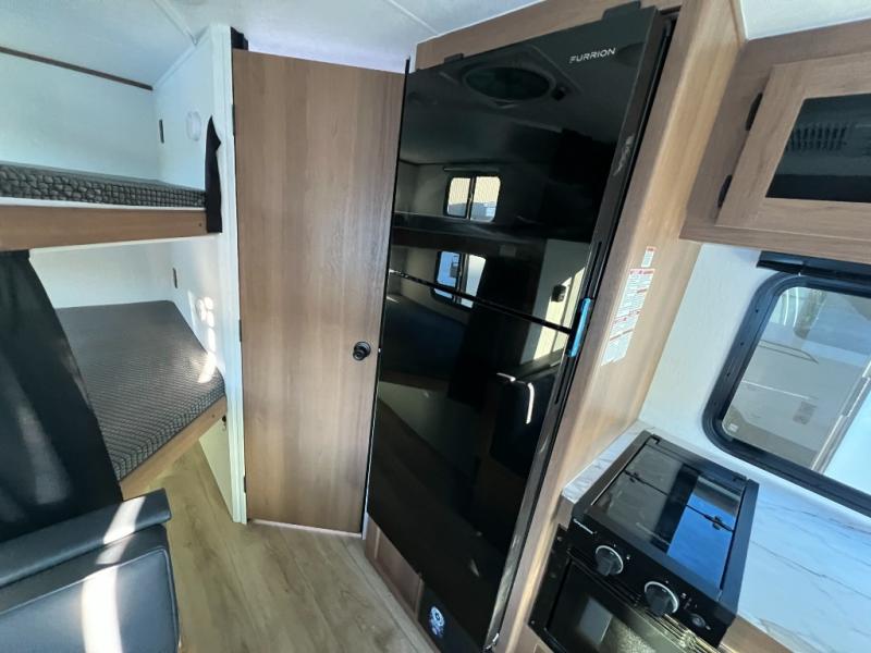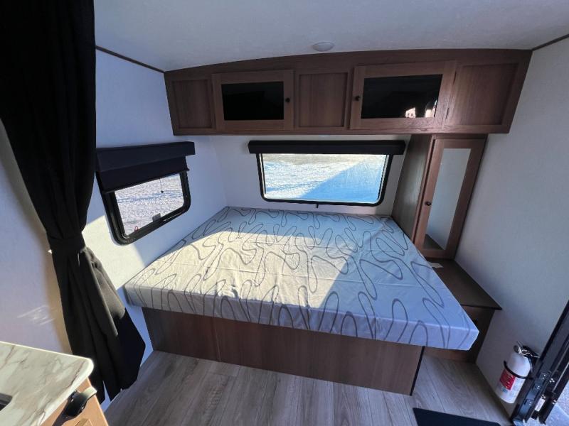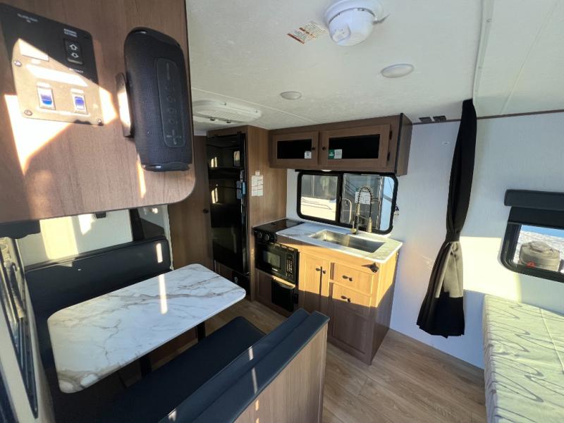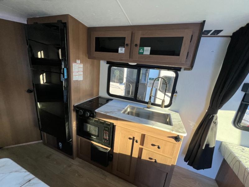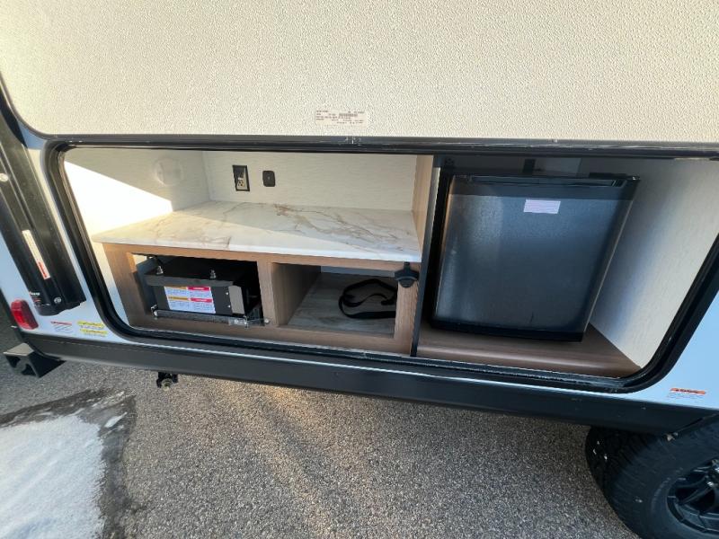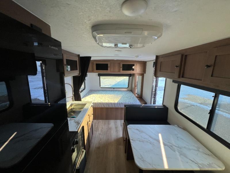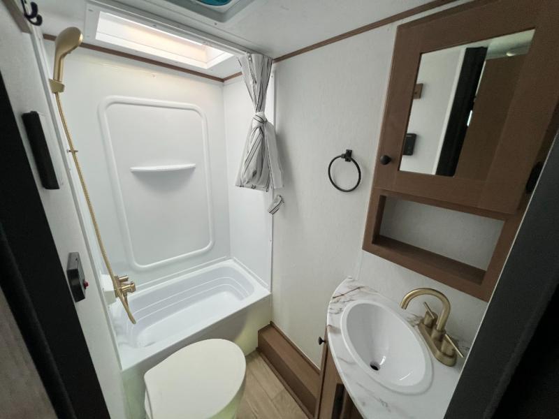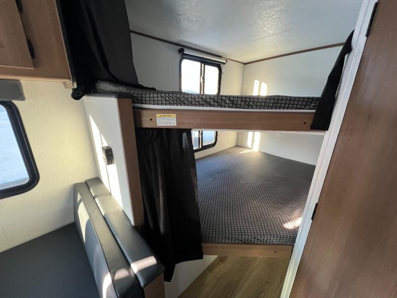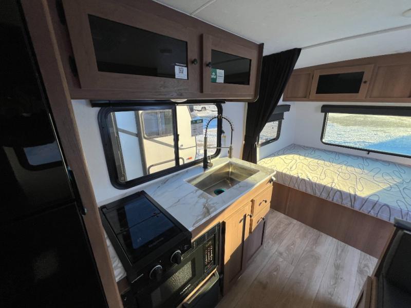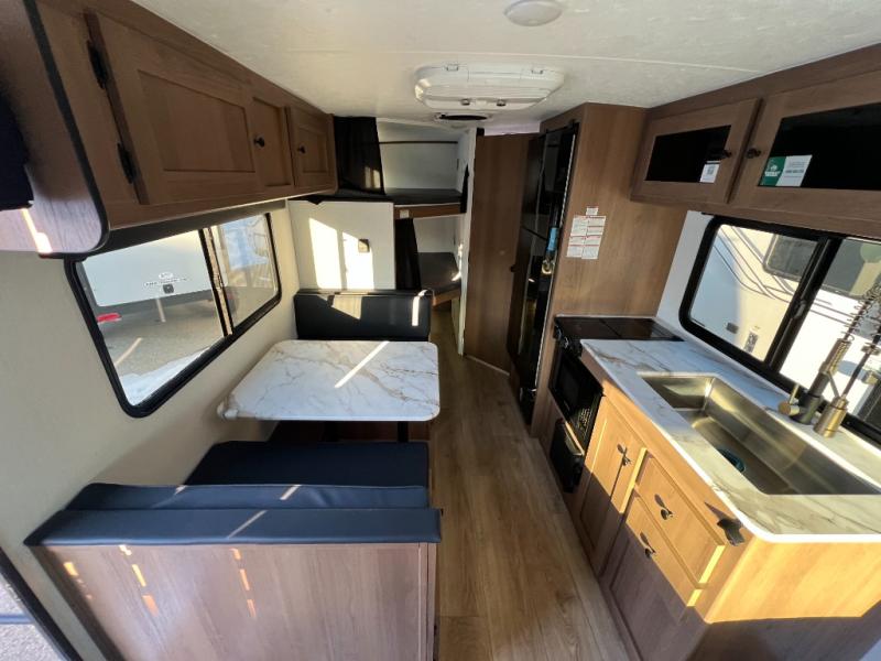 This travel trailer offers versatility with a front fixed bed or optional Murphy bed depending on your needs. There is a rear corner double bed bunk above a lower flip up double bed and a booth dinette that can transform into an extra sleeping space when you're not using it to enjoy a meal or play a card game. Everyone can stay clean with tub/shower in the rear corner bathroom and keep their bellies full with the two burner cooktop and 10 cu. ft. 12V refrigerator. You can even cook outdoors with the exterior camp kitchen while staying protected by the power awning with LED lighting!