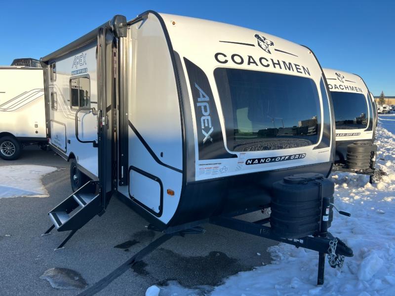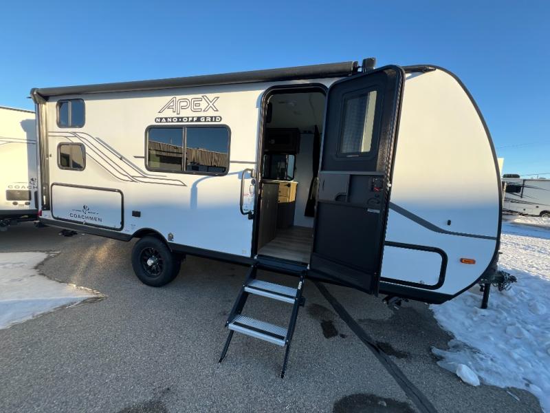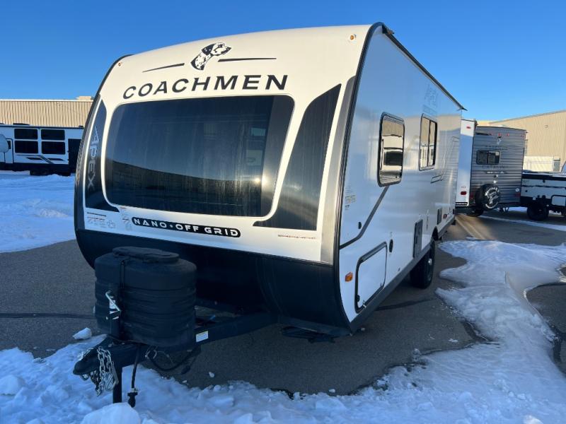 You will find comfort, convenience, and a sturdy construction with each of these Coachmen RV Apex Nano travel trailers! They are held together with an aluma-cage construction, an I-beam chassis, plus vacuum-bonded laminated dual Azdel fiberglass walls for double the protection against the elements. The 400-watt solar panel with a 30 amp control charger is included, along with two 20 lb. LP tanks, a high velocity power roof vent, plus 12V outlets to keep you powered up. More exterior features include a hot/cold shower, four stabilizer jacks, a power awning with LED lighting, and radius thumb latch baggage doors to easily pack and unload your gear. You will love the interior of your Apex Nano with Congoleum residential flooring, one-piece seamless edge countertops, matte black hardware in the galley, and a hand-crafted wood medicine cabinet in the bath.