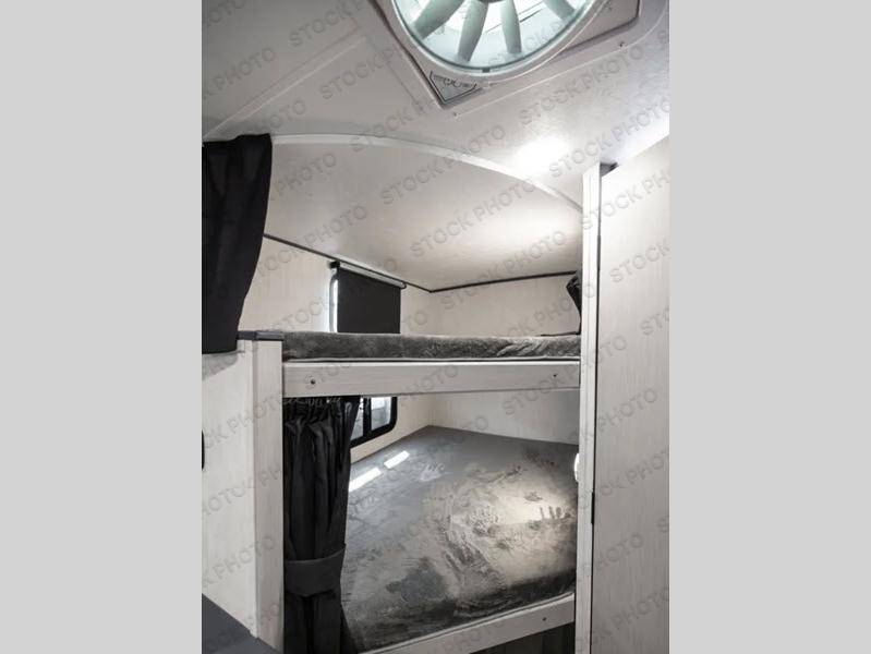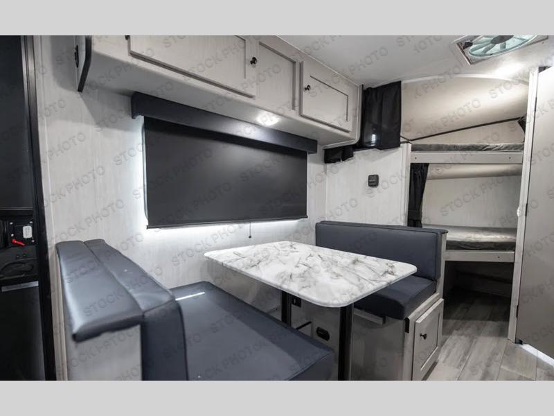 This travel trailer offers versatility with a front fixed bed or optional Murphy bed depending on your needs. There is a rear corner double bed bunk above a lower flip up double bed and a booth dinette that can transform into an extra sleeping space when you're not using it to enjoy a meal or play a card game. Everyone can stay clean with tub/shower in the rear corner bathroom and keep their bellies full with the two burner cooktop and 10 cu. ft. 12V refrigerator. You can even cook outdoors with the exterior camp kitchen while staying protected by the power awning with LED lighting!