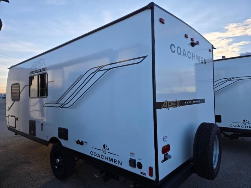 You will find comfort, convenience, and a sturdy construction with each of these Coachmen RV Apex Nano travel trailers! They are held together with an aluma-cage construction, an I-beam chassis, plus vacuum-bonded laminated dual Azdel fiberglass walls for double the protection against the elements. The 400-watt solar panel with a 30 amp control charger is included, along with two 20 lb. LP tanks, a high velocity power roof vent, plus 12V outlets to keep you powered up. More exterior features include a hot/cold shower, four stabilizer jacks, a power awning with LED lighting, and radius thumb latch baggage doors to easily pack and unload your gear. You will love the interior of your Apex Nano with Congoleum residential flooring, one-piece seamless edge countertops, matte black hardware in the galley, and a hand-crafted wood medicine cabinet in the bath.