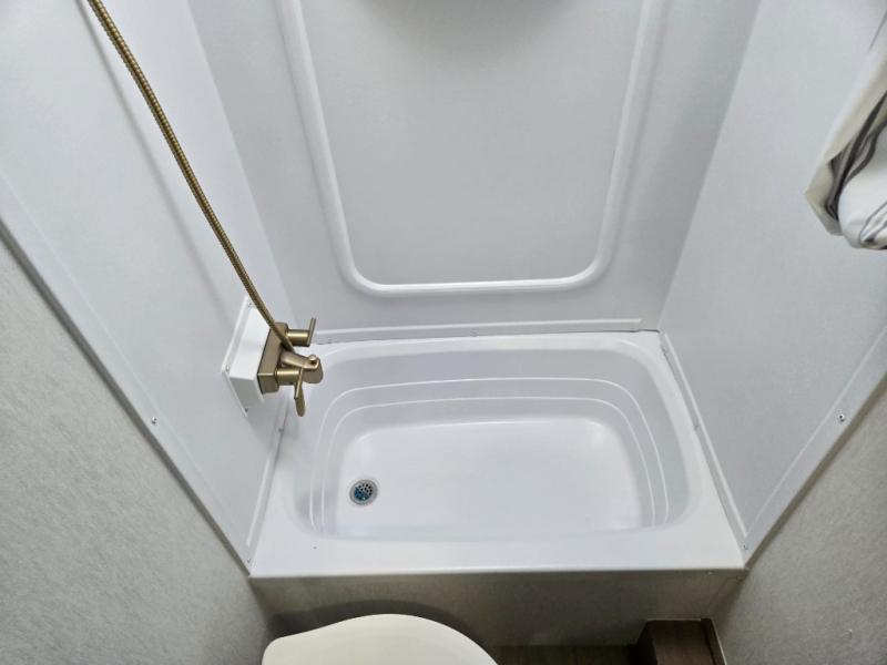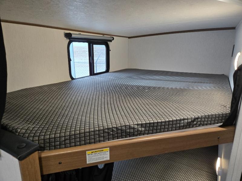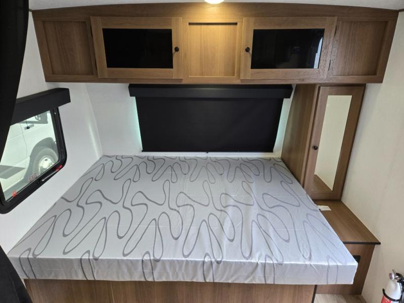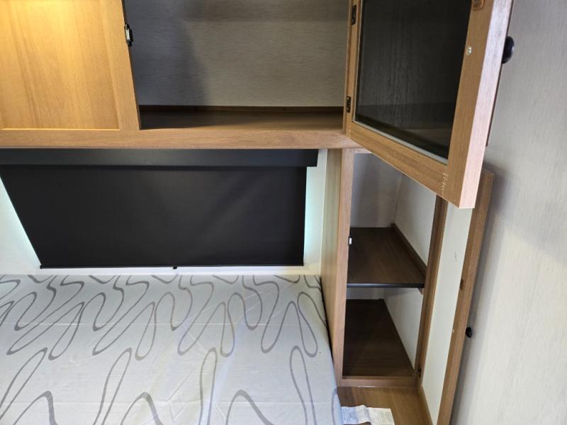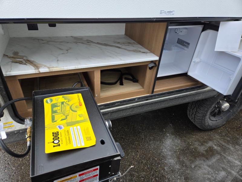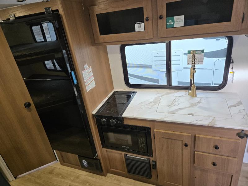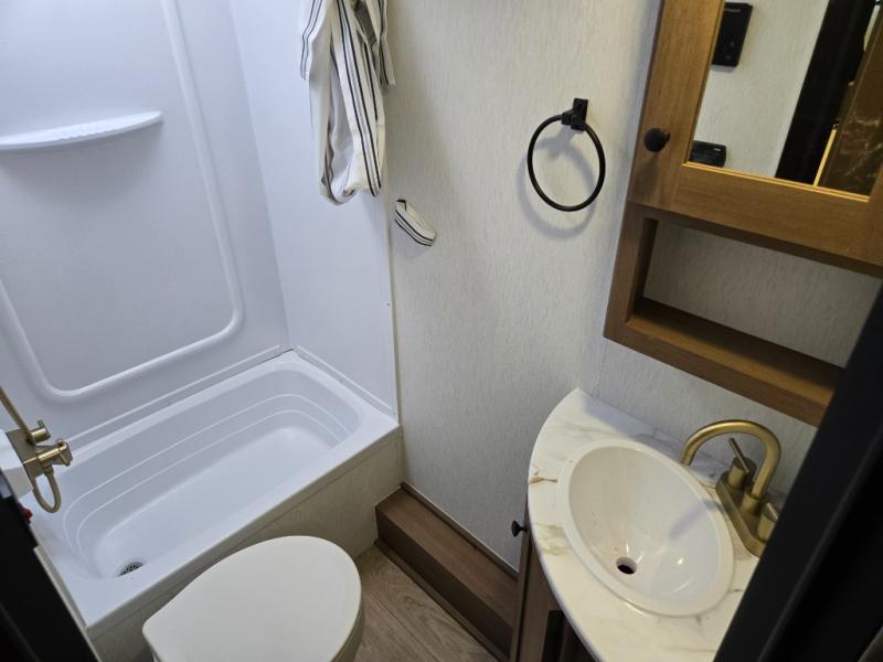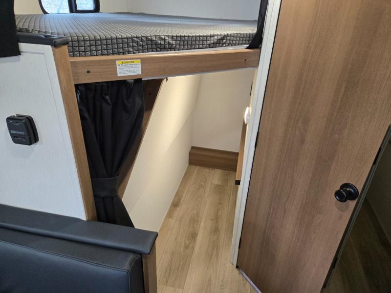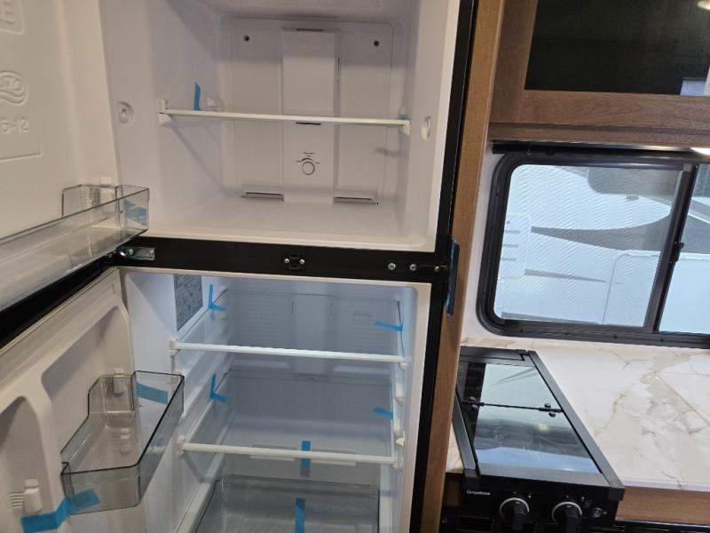 This travel trailer offers versatility with a front fixed bed or optional Murphy bed depending on your needs. There is a rear corner double bed bunk above a lower flip up double bed and a booth dinette that can transform into an extra sleeping space when you're not using it to enjoy a meal or play a card game. Everyone can stay clean with tub/shower in the rear corner bathroom and keep their bellies full with the two burner cooktop and 10 cu. ft. 12V refrigerator. You can even cook outdoors with the exterior camp kitchen while staying protected by the power awning with LED lighting!