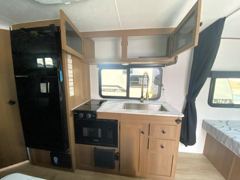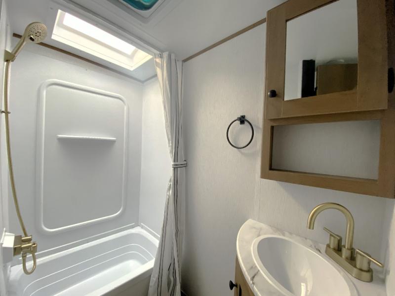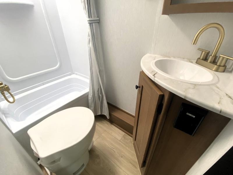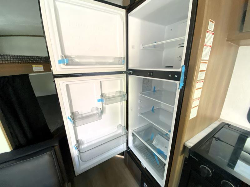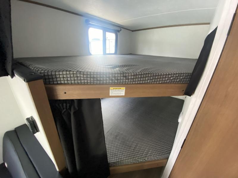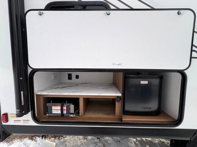 This travel trailer offers versatility with a front fixed bed or optional Murphy bed depending on your needs. There is a rear corner double bed bunk above a lower flip up double bed and a booth dinette that can transform into an extra sleeping space when you're not using it to enjoy a meal or play a card game. Everyone can stay clean with tub/shower in the rear corner bathroom and keep their bellies full with the two burner cooktop and 10 cu. ft. 12V refrigerator. You can even cook outdoors with the exterior camp kitchen while staying protected by the power awning with LED lighting!