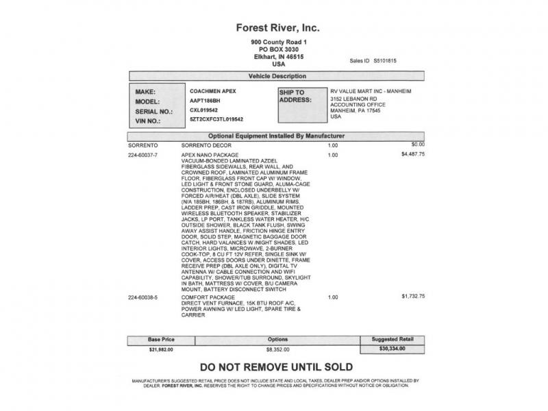 You will find comfort, convenience, and a sturdy construction with each of these Coachmen RV Apex Nano travel trailers! They are held together with an aluma-cage construction, an I-beam chassis, plus vacuum-bonded laminated dual Azdel fiberglass walls for double the protection against the elements. The 400-watt solar panel with a 30 amp control charger is included, along with two 20 lb. LP tanks, a high velocity power roof vent, plus 12V outlets to keep you powered up. More exterior features include a hot/cold shower, four stabilizer jacks, a power awning with LED lighting, and radius thumb latch baggage doors to easily pack and unload your gear. You will love the interior of your Apex Nano with Congoleum residential flooring, one-piece seamless edge countertops, matte black hardware in the galley, and a hand-crafted wood medicine cabinet in the bath.