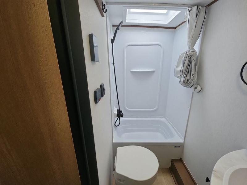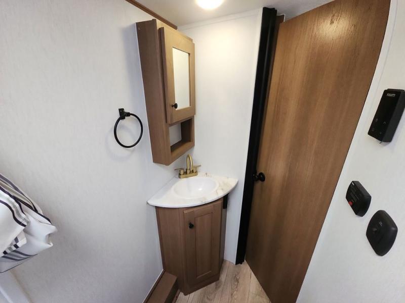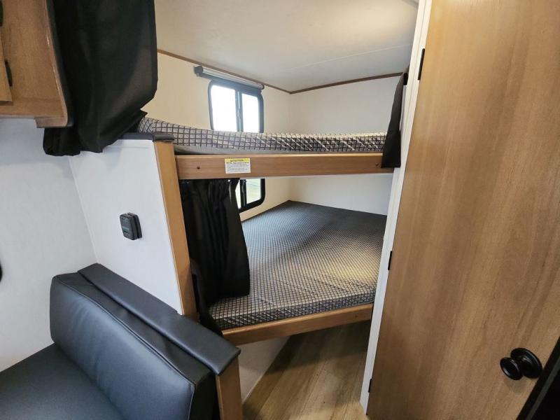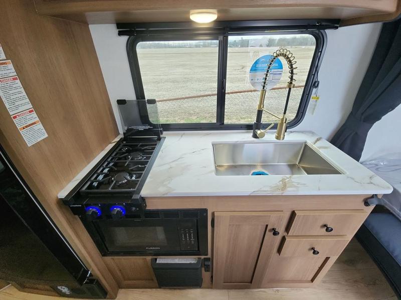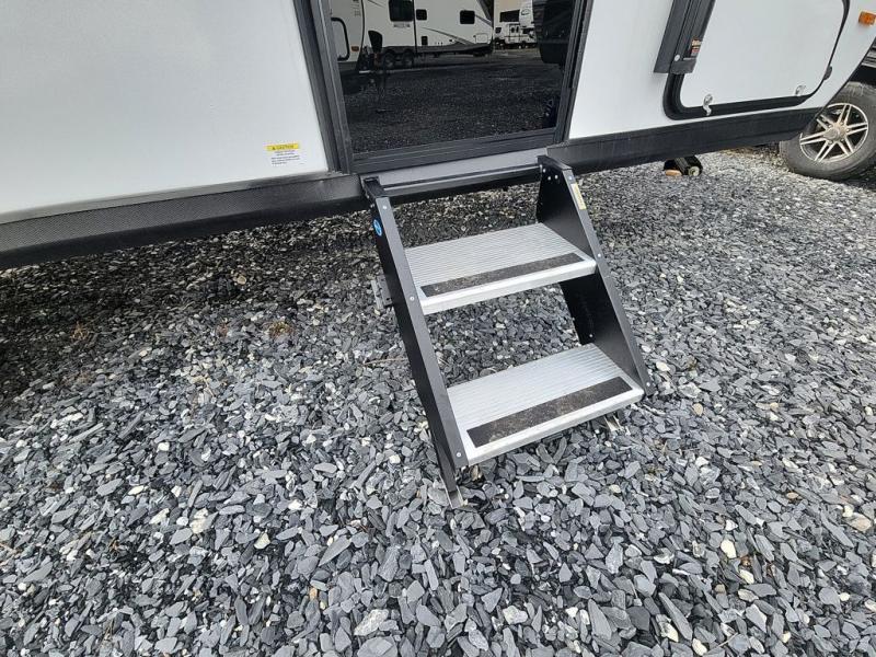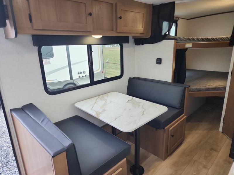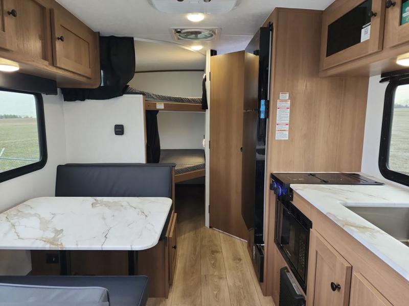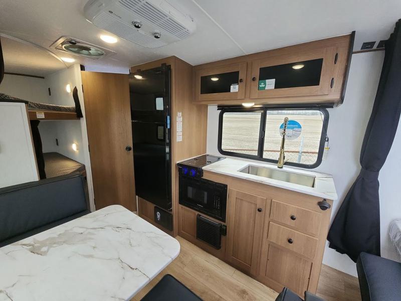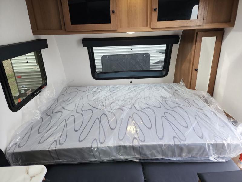 This travel trailer offers versatility with a front fixed bed or optional Murphy bed depending on your needs. There is a rear corner double bed bunk above a lower flip up double bed and a booth dinette that can transform into an extra sleeping space when you're not using it to enjoy a meal or play a card game. Everyone can stay clean with tub/shower in the rear corner bathroom and keep their bellies full with the two burner cooktop and 10 cu. ft. 12V refrigerator. You can even cook outdoors with the exterior camp kitchen while staying protected by the power awning with LED lighting!