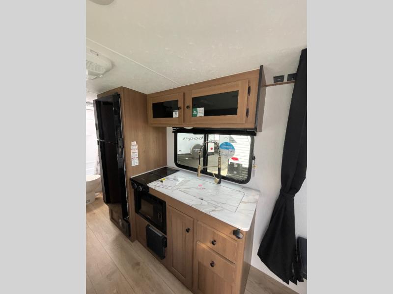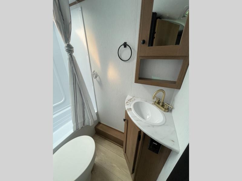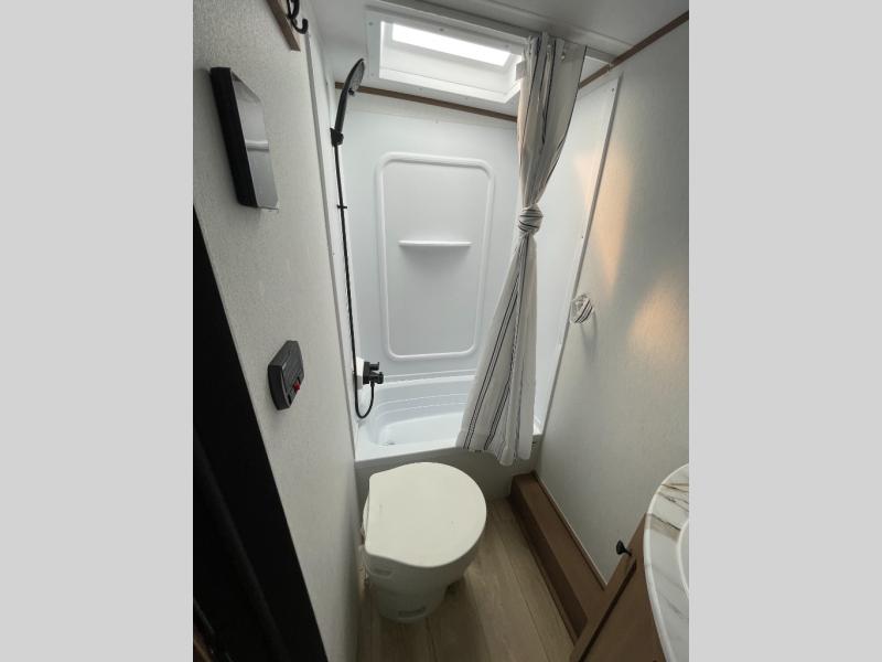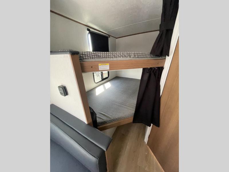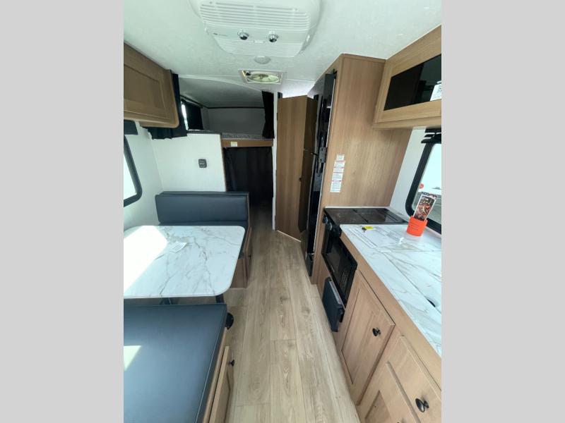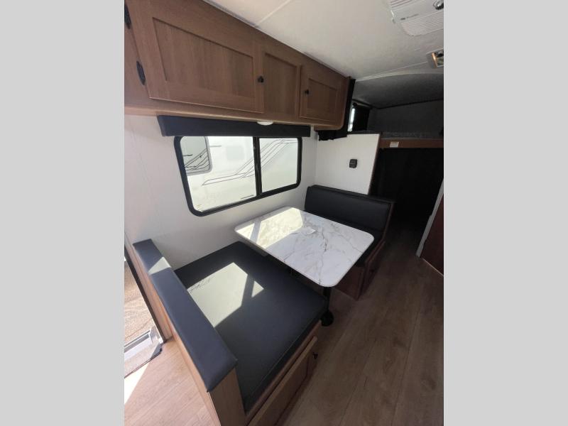 This travel trailer offers versatility with a front fixed bed or optional Murphy bed depending on your needs. There is a rear corner double bed bunk above a lower flip up double bed and a booth dinette that can transform into an extra sleeping space when you're not using it to enjoy a meal or play a card game. Everyone can stay clean with tub/shower in the rear corner bathroom and keep their bellies full with the two burner cooktop and 10 cu. ft. 12V refrigerator. You can even cook outdoors with the exterior camp kitchen while staying protected by the power awning with LED lighting!