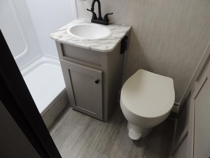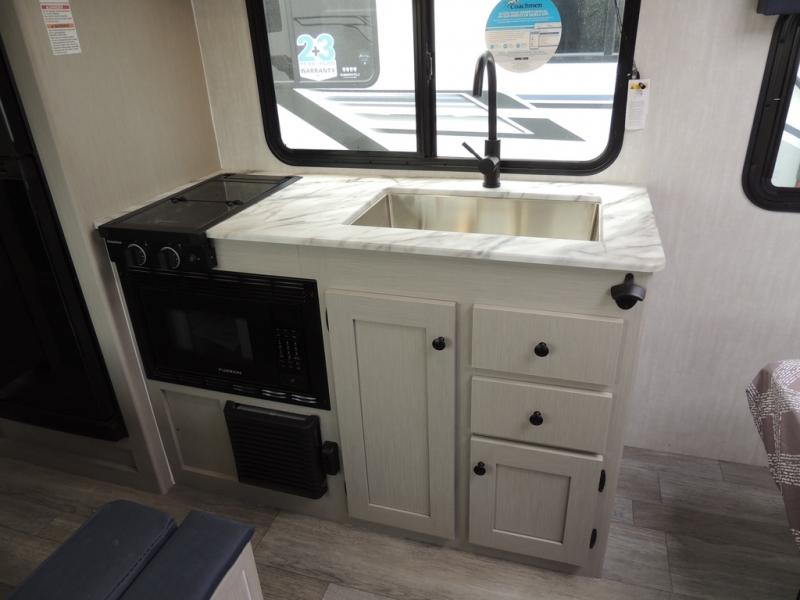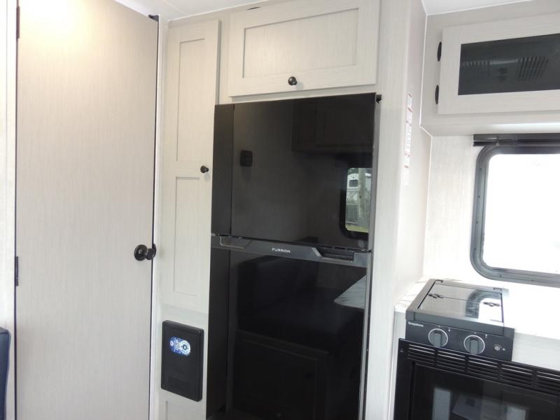 Easily head out to the campgrounds with this easy to tow trailer that offers indoor amenities to keep you fed, cleaned and relaxed! The galley kitchen provides a microwave, two burner cooktop and a pantry, plus an 8 cu. ft. 12V refrigerator all at your fingertips, and the rear full bathroom gives you a shower, wardrobe and more! You can eat your meals inside at the booth dinette which also provides sleeping space for one, and the walk-around queen-size bed up front with two wardrobes will allow you to sleep well while away from home.