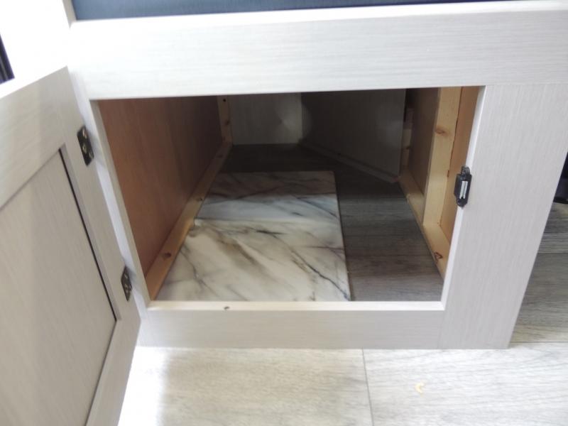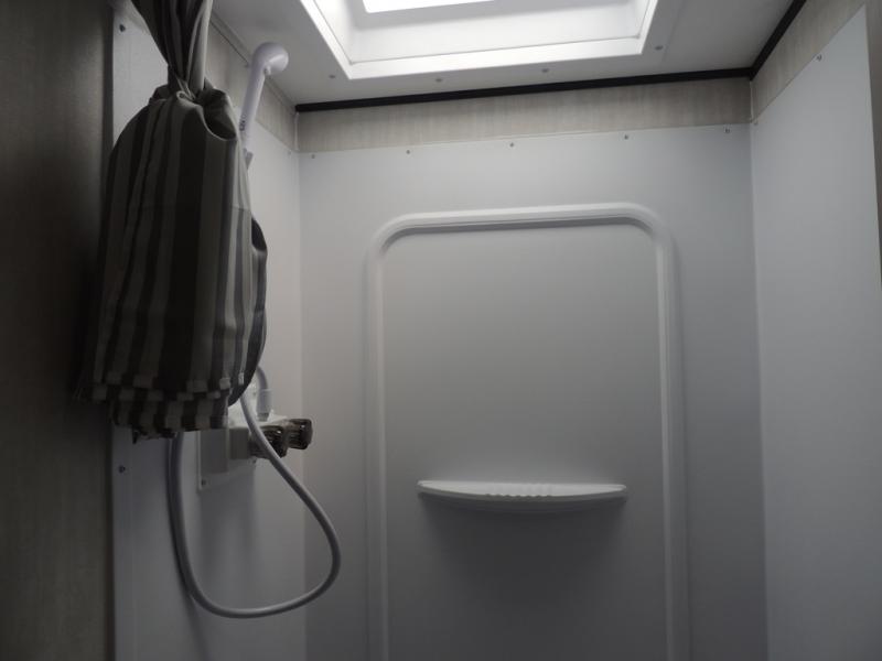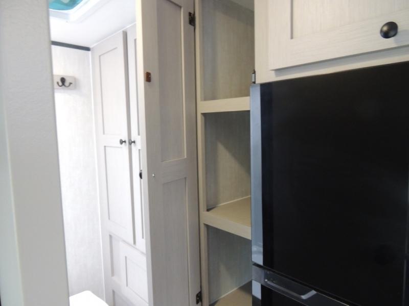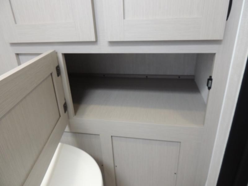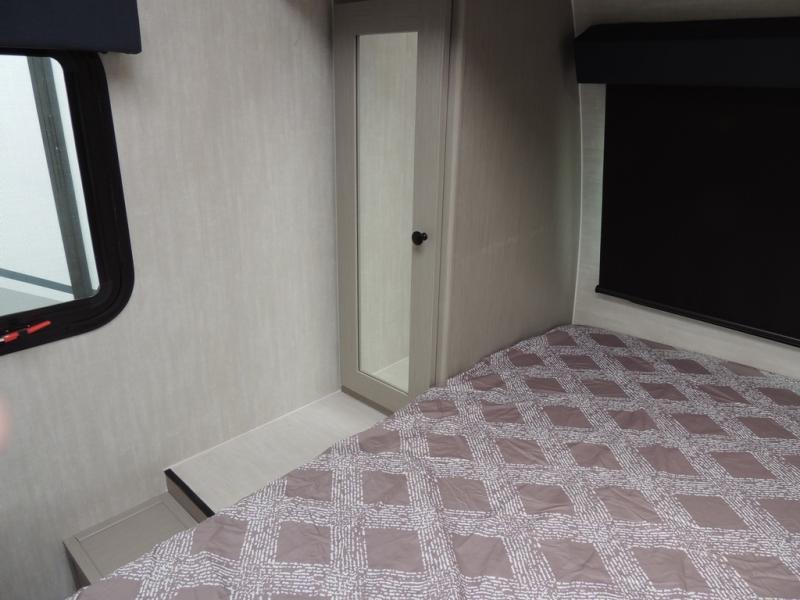 What I liked most: Quite roomy for a small camper. Plenty of storage next to the bed with 2 vertical cabinets with mirrors and 2 overhead horizontal cabinets with glass doors. Bathroom has lots of storage with 4 cabinets.