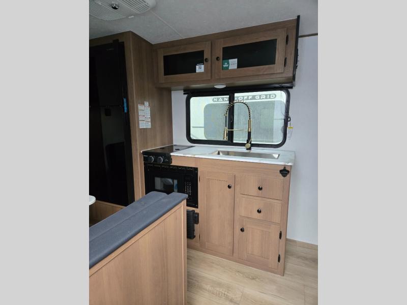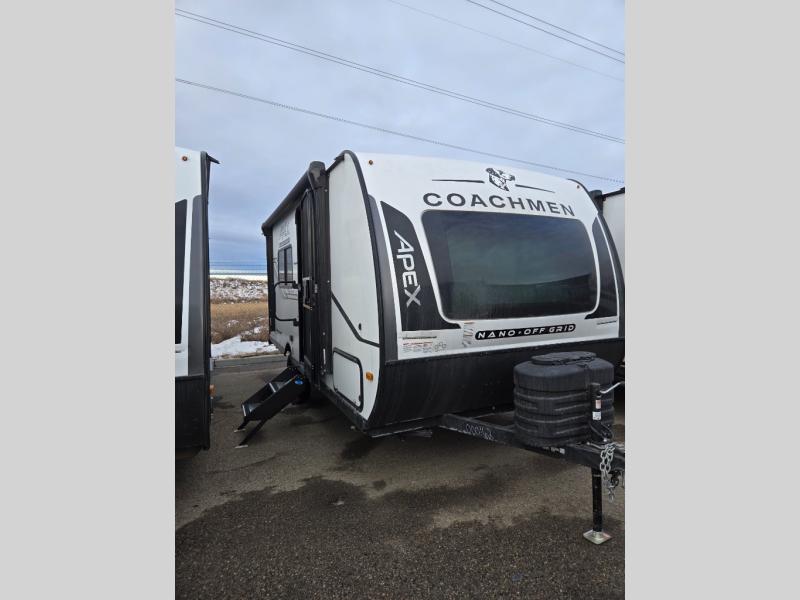 You will find comfort, convenience, and a sturdy construction with each of these Coachmen RV Apex Nano travel trailers! They are held together with an aluma-cage construction, an I-beam chassis, plus vacuum-bonded laminated dual Azdel fiberglass walls for double the protection against the elements. The 400-watt solar panel with a 30-amp control charger is included, along with two 20 lb. LP tanks, a high velocity power roof vent, plus 12V outlets to keep you powered up. More exterior features include a hot/cold shower, four stabilizer jacks, a power awning with LED lighting, and radius thumb latch baggage doors to easily pack and unload your gear. You will love the interior of your Apex Nano with Congoleum residential flooring, one-piece seamless edge countertops, matte black hardware in the galley, and a hand-crafted wood medicine cabinet in the bath.