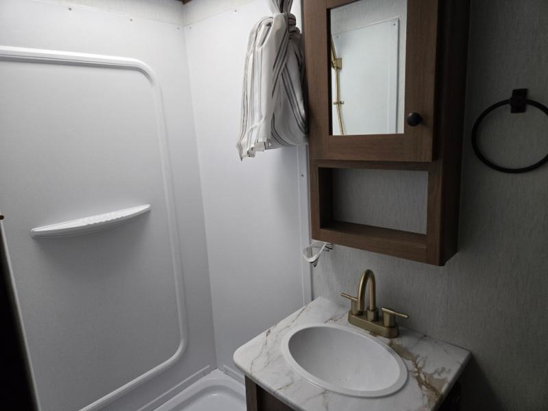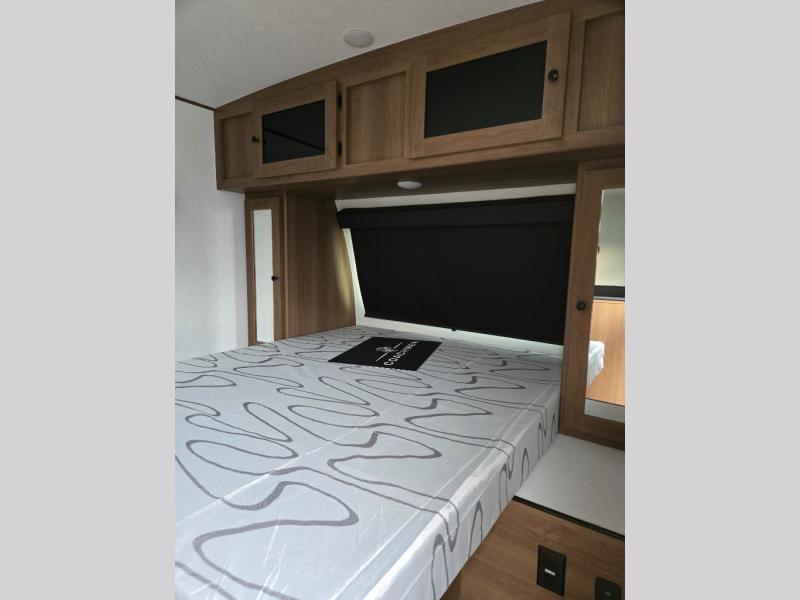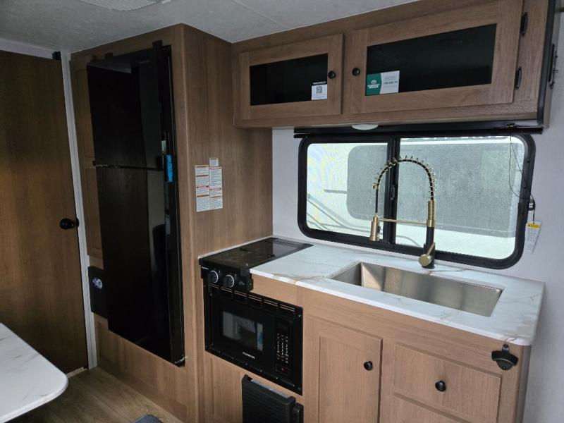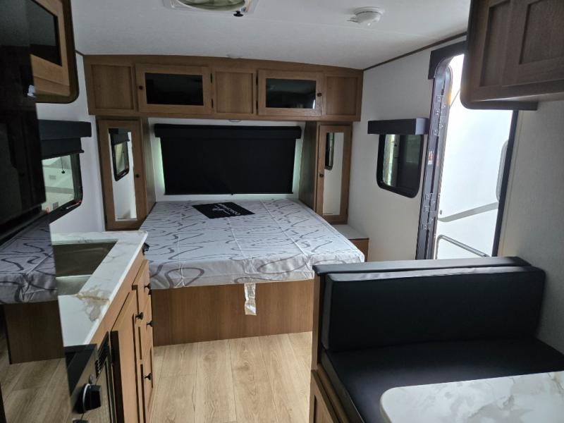 Easily head out to the campgrounds with this easy to tow trailer that offers indoor amenities to keep you fed, cleaned and relaxed! The galley kitchen provides a microwave, two burner cooktop and a pantry, plus a 10-cu. ft. 12V refrigerator all at your fingertips, and the rear full bathroom gives you a shower, wardrobe and more! You can eat your meals inside at the booth dinette which also provides sleeping space for one, and the walk-around queen-size bed up front with two wardrobes will allow you to sleep well while away from home.