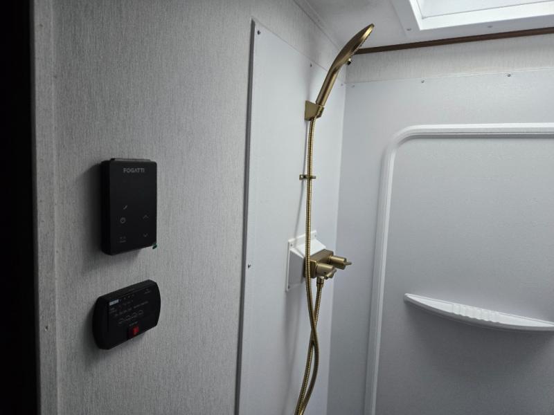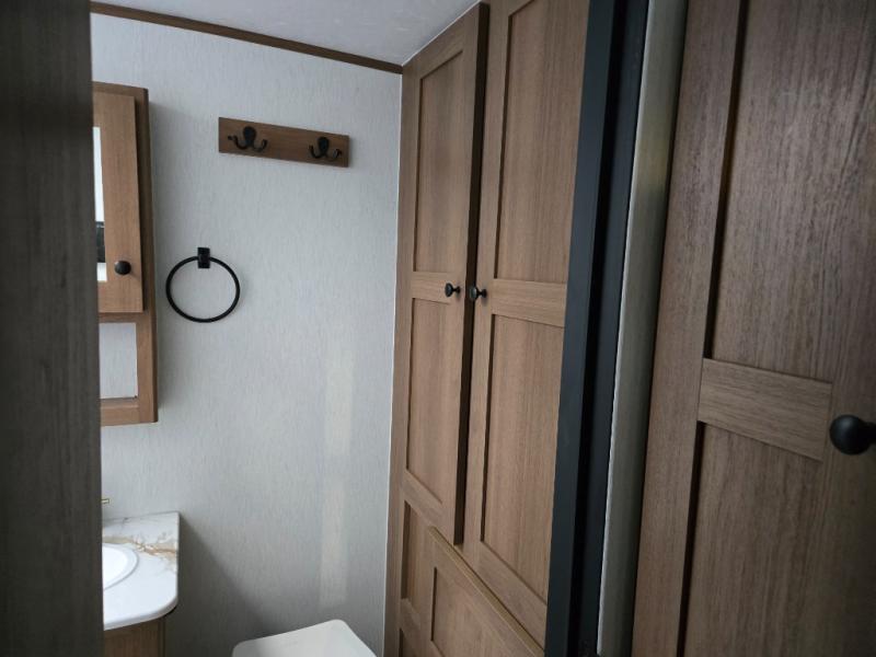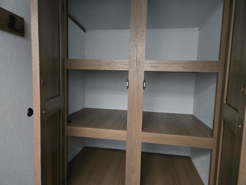 What I liked most: Quite roomy for a small camper. Plenty of storage next to the bed with 2 vertical cabinets with mirrors and 2 overhead horizontal cabinets with glass doors. Bathroom has lots of storage with 4 cabinets.