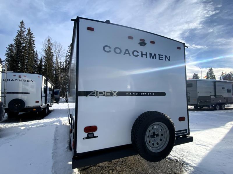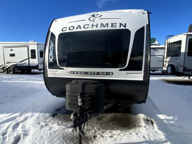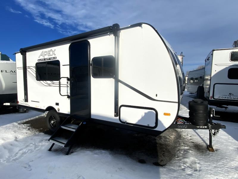 You will find comfort, convenience, and a sturdy construction with each of these Coachmen RV Apex Nano travel trailers! They are held together with an aluma-cage construction, an I-beam chassis, plus vacuum-bonded laminated dual Azdel fiberglass walls for double the protection against the elements. The 200-watt solar panel with a 30 amp control charger is included within the Off-Grid Package, along with two 20 lb. LP tanks, a high velocity power roof vent, plus 12V outlets to keep you powered up. More exterior feature include a hot/cold shower, four stabilizer jacks, a power awning with LED lighting, and magnetic baggage door catches to easily pack and unload your gear. You will love the interior of your Apex Nano with Congoleum residential flooring, one-piece seamless edge countertops, matte black hardware in the galley, and a hand-crafted wood medicine cabinet in the bath.