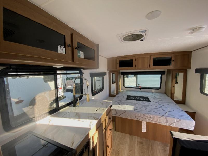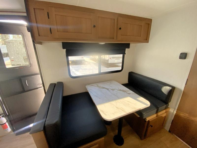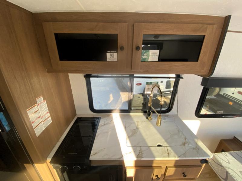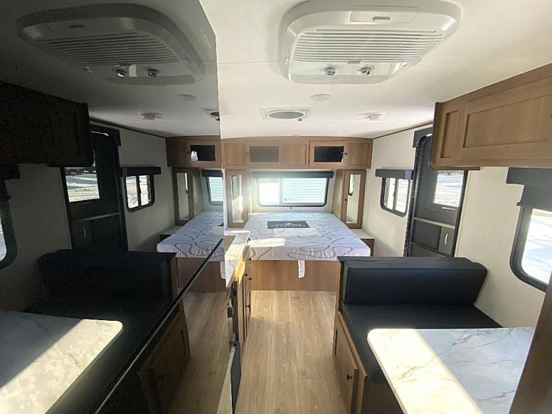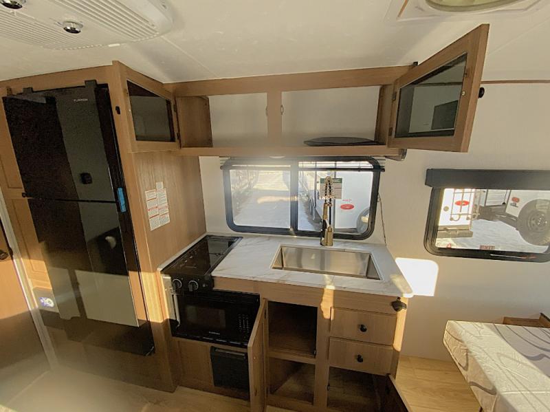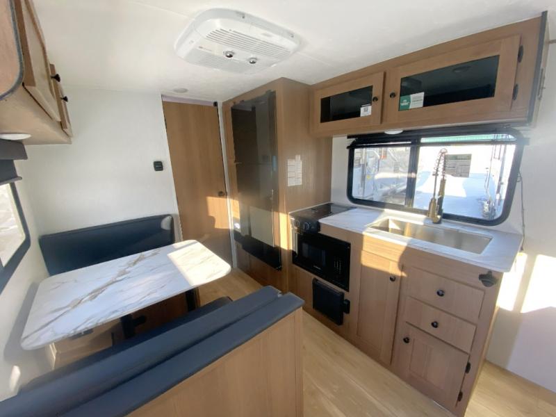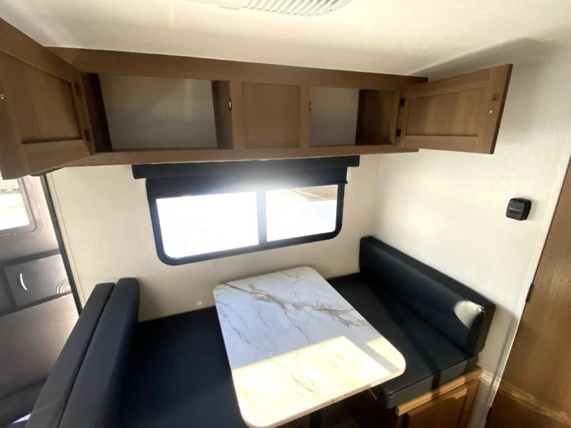 Easily head out to the campgrounds with this easy to tow trailer that offers indoor amenities to keep you fed, cleaned and relaxed! The galley kitchen provides a microwave, two burner cooktop and a pantry, plus an 8 cu. ft. 12V refrigerator all at your fingertips, and the rear full bathroom gives you a shower, wardrobe and more! You can eat your meals inside at the booth dinette which also provides sleeping space for one, and the walk-around queen-size bed up front with two wardrobes will allow you to sleep well while away from home.