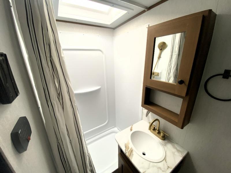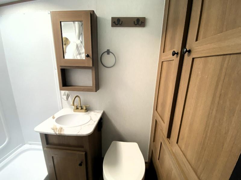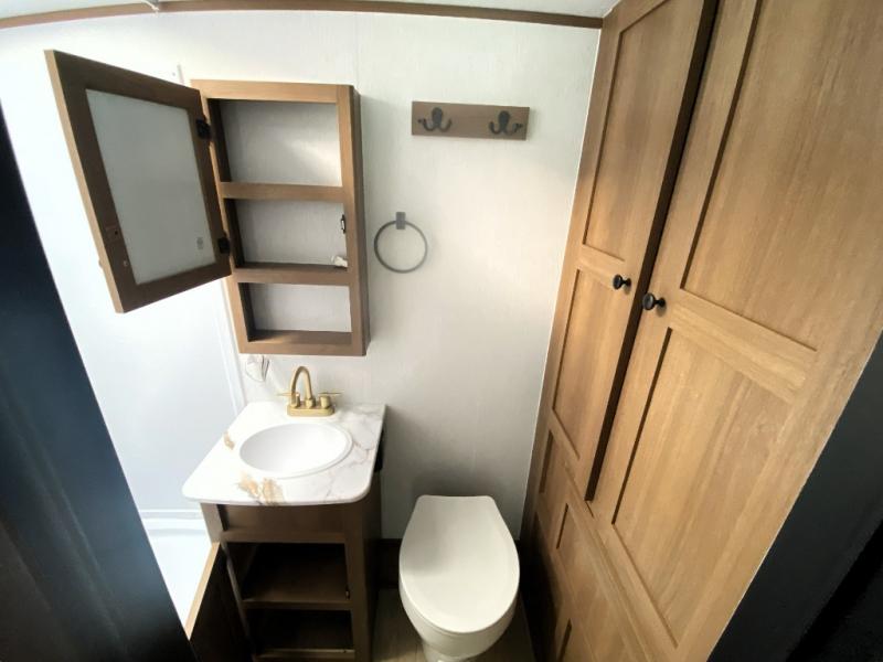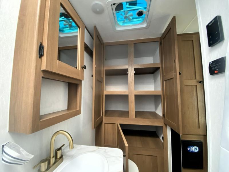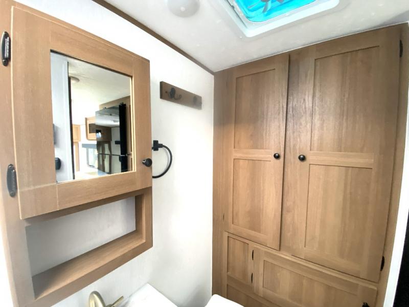 What I liked most: Quite roomy for a small camper. Plenty of storage next to the bed with 2 vertical cabinets with mirrors and 2 overhead horizontal cabinets with glass doors. Bathroom has lots of storage with 4 cabinets.