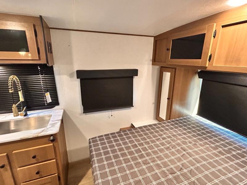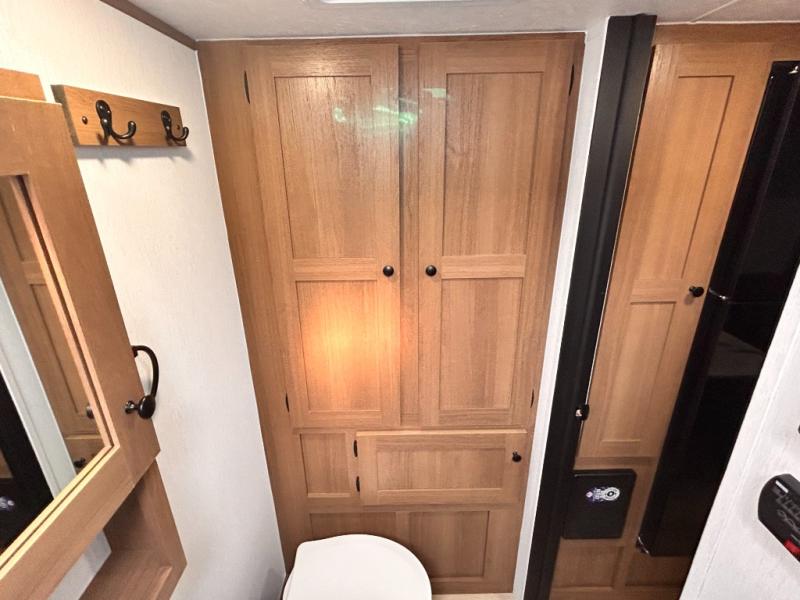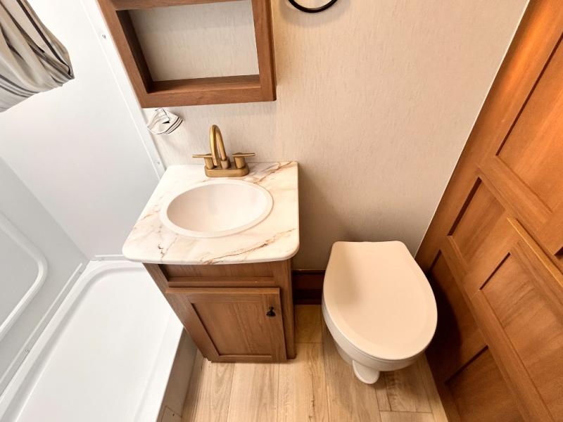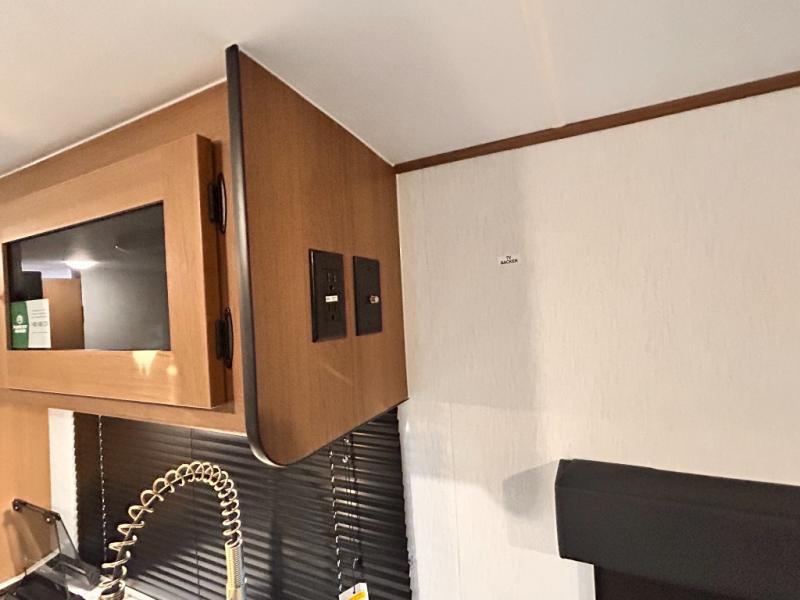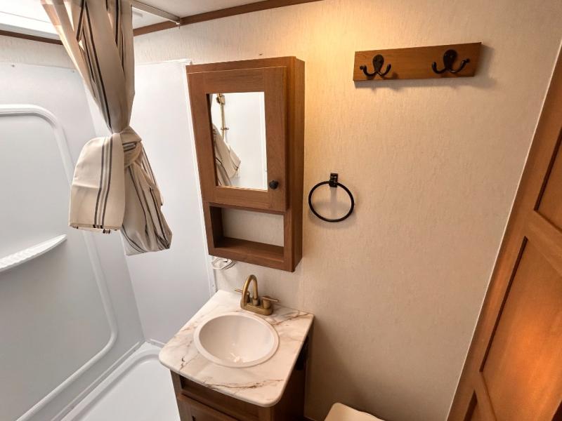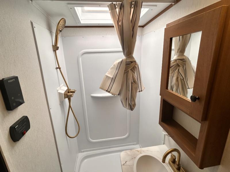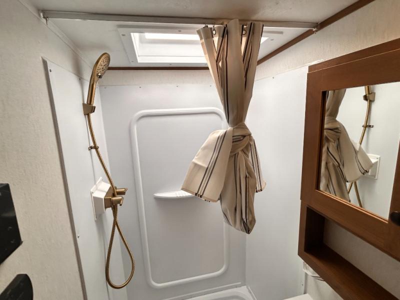 What I liked most: Quite roomy for a small camper. Plenty of storage next to the bed with 2 vertical cabinets with mirrors and 2 overhead horizontal cabinets with glass doors. Bathroom has lots of storage with 4 cabinets.