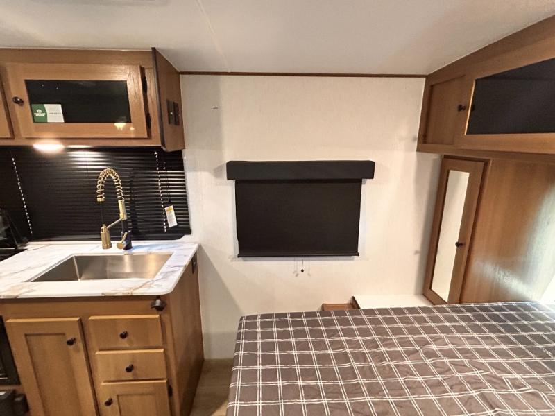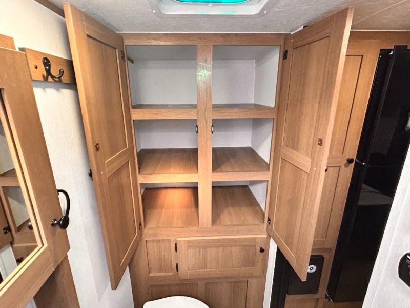 What I liked most: Quite roomy for a small camper. Plenty of storage next to the bed with 2 vertical cabinets with mirrors and 2 overhead horizontal cabinets with glass doors. Bathroom has lots of storage with 4 cabinets.