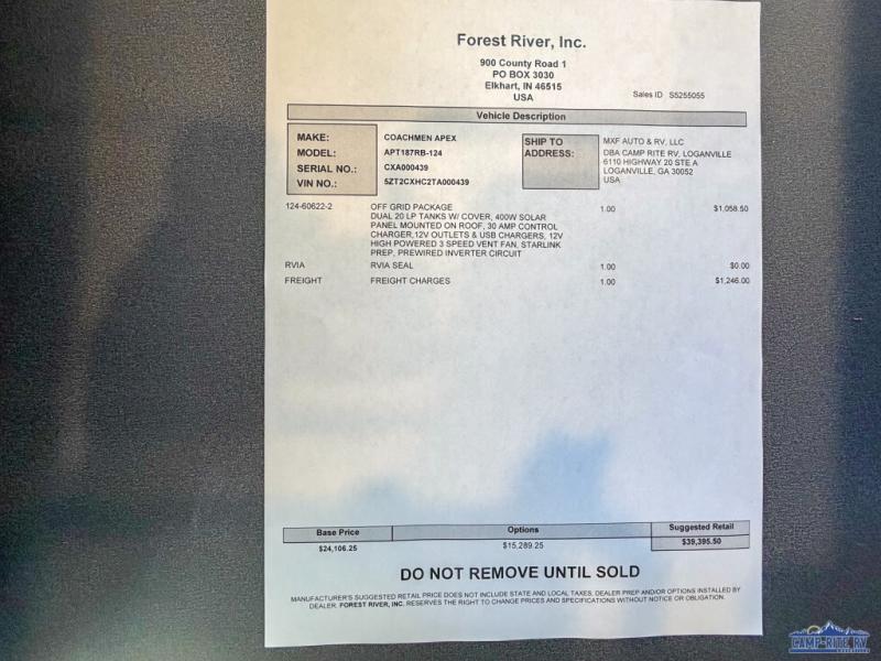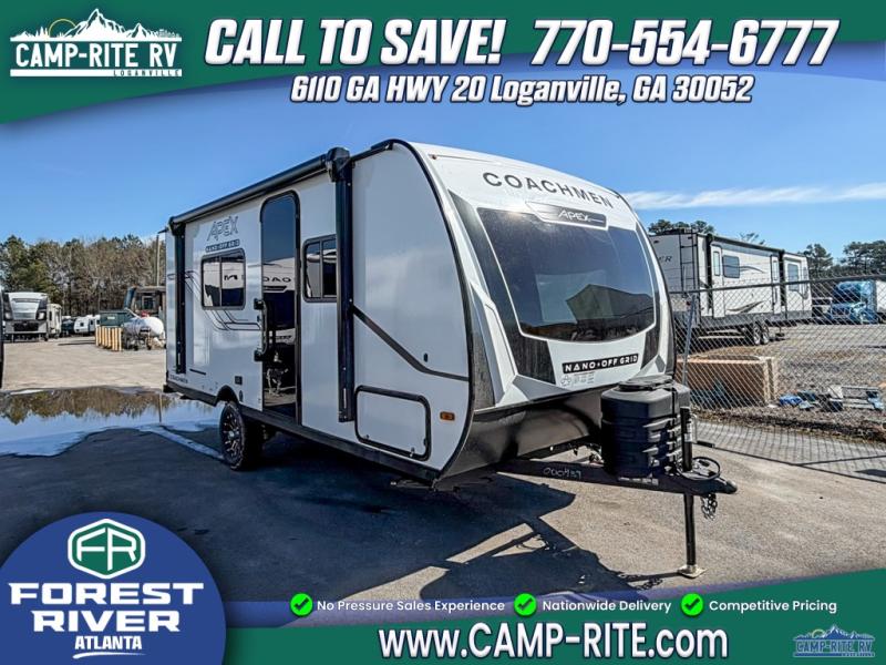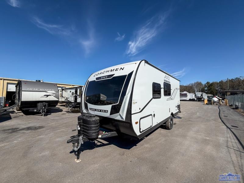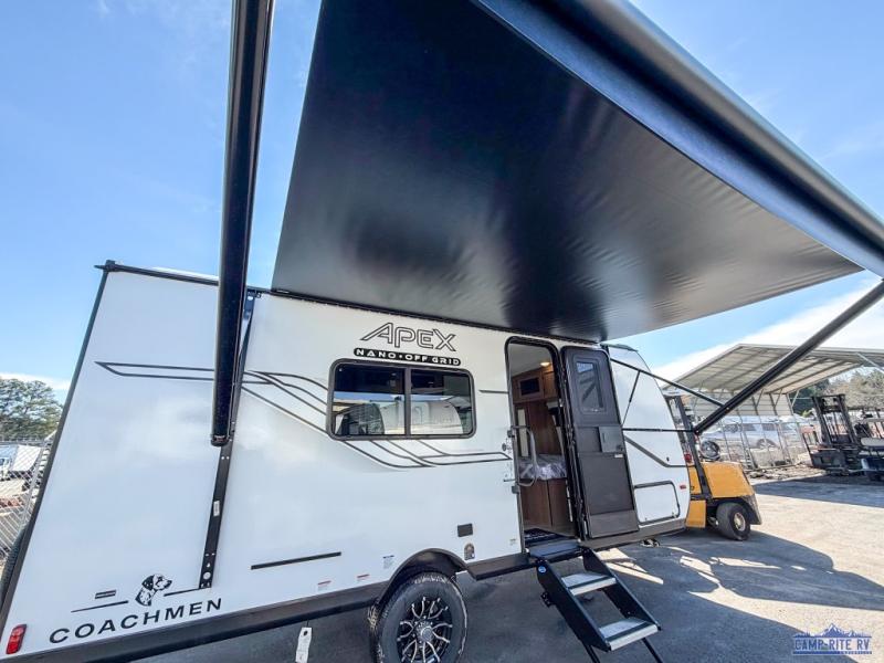 You will find comfort, convenience, and a sturdy construction with each of these Coachmen RV Apex Nano travel trailers! They are held together with an aluma-cage construction, an I-beam chassis, plus vacuum-bonded laminated dual Azdel fiberglass walls for double the protection against the elements. The 400-watt solar panel with a 30-amp control charger is included, along with two 20 lb. LP tanks, a high velocity power roof vent, plus 12V outlets to keep you powered up. More exterior features include a hot/cold shower, four stabilizer jacks, a power awning with LED lighting, and radius thumb latch baggage doors to easily pack and unload your gear. You will love the interior of your Apex Nano with Congoleum residential flooring, one-piece seamless edge countertops, matte black hardware in the galley, and a hand-crafted wood medicine cabinet in the bath.