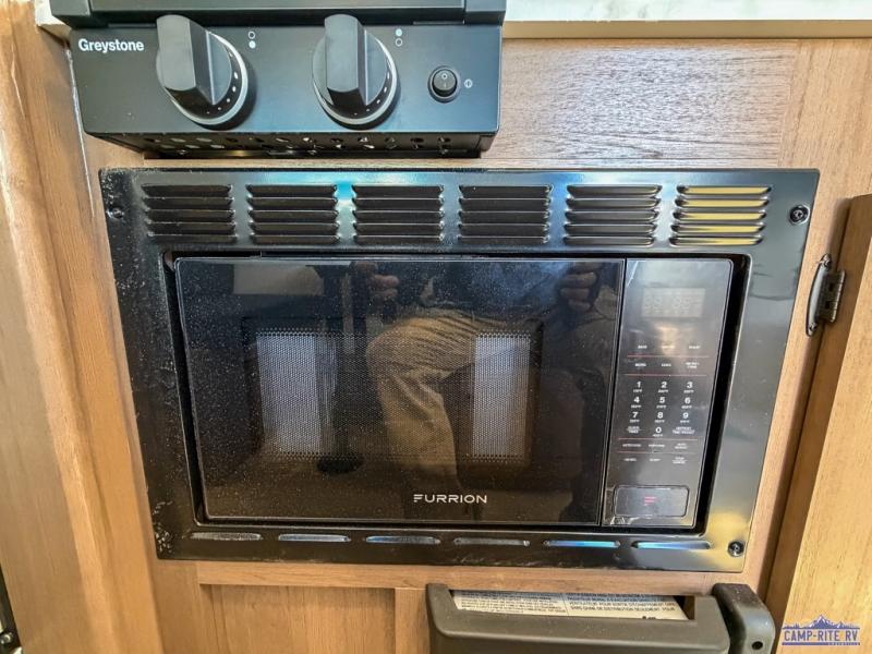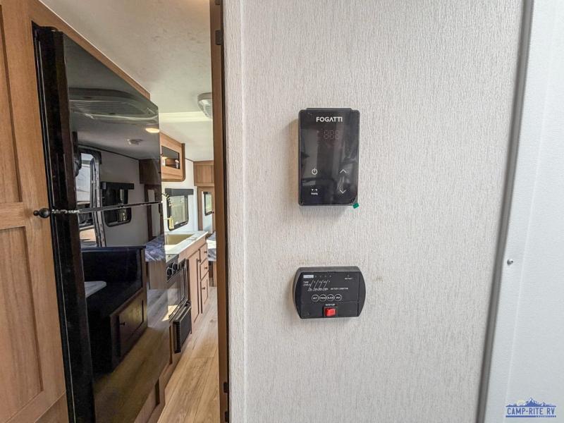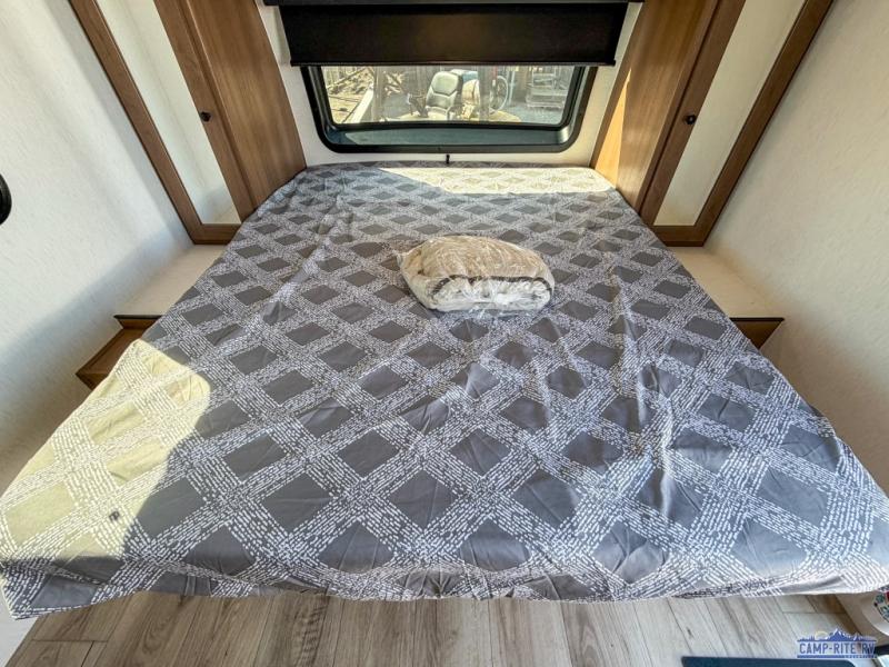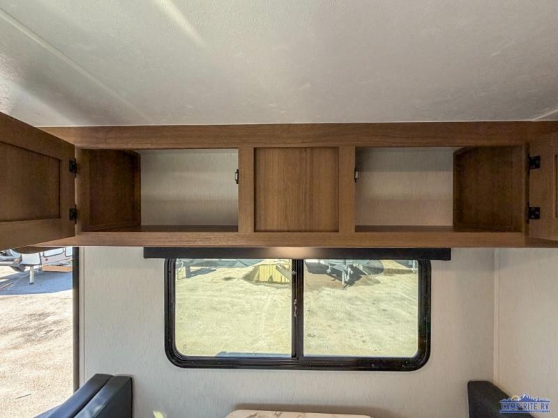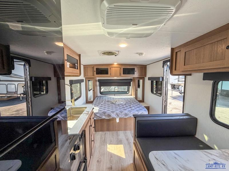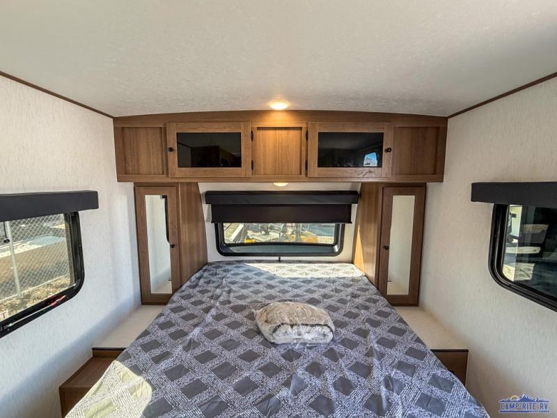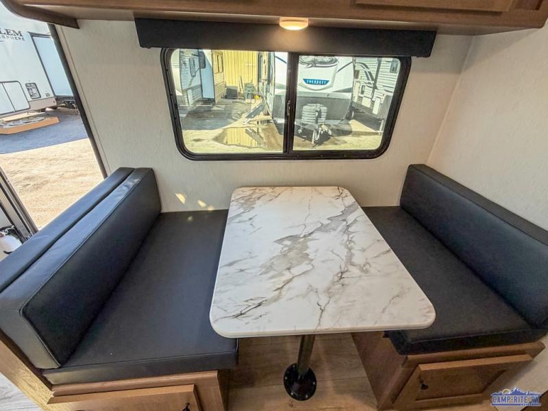 Easily head out to the campgrounds with this easy to tow trailer that offers indoor amenities to keep you fed, cleaned and relaxed! The galley kitchen provides a microwave, two burner cooktop and a pantry, plus a 10-cu. ft. 12V refrigerator all at your fingertips, and the rear full bathroom gives you a shower, wardrobe and more! You can eat your meals inside at the booth dinette which also provides sleeping space for one, and the walk-around queen-size bed up front with two wardrobes will allow you to sleep well while away from home.