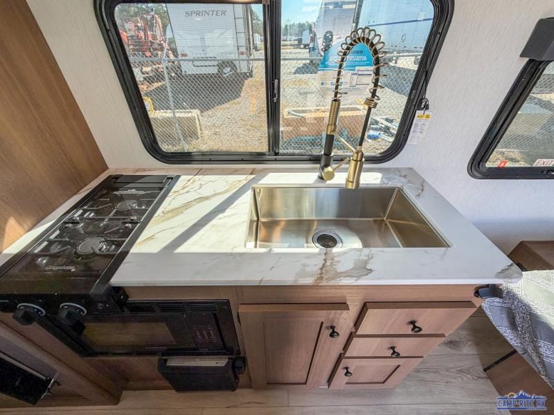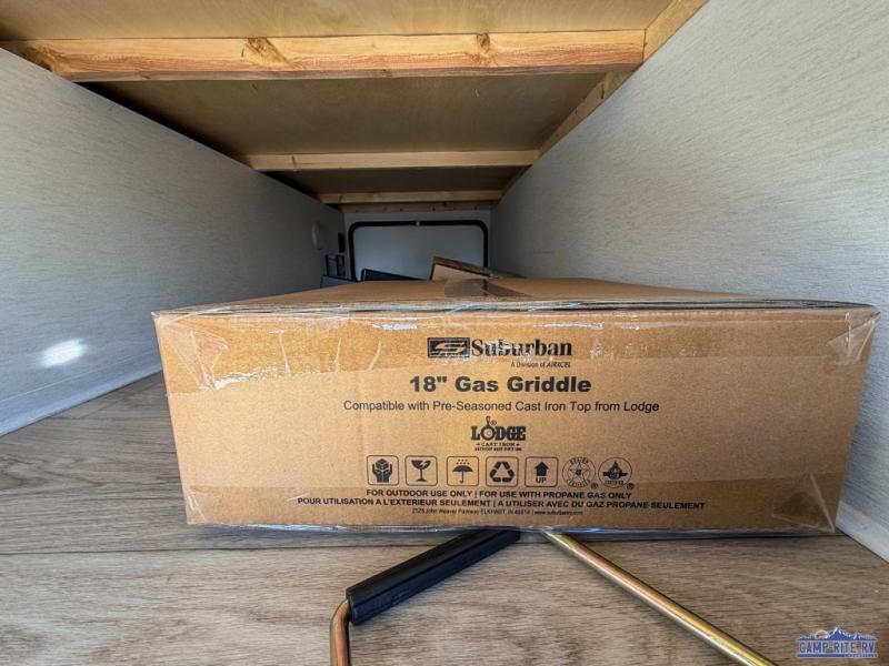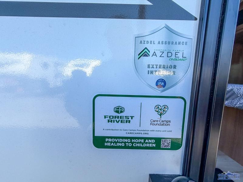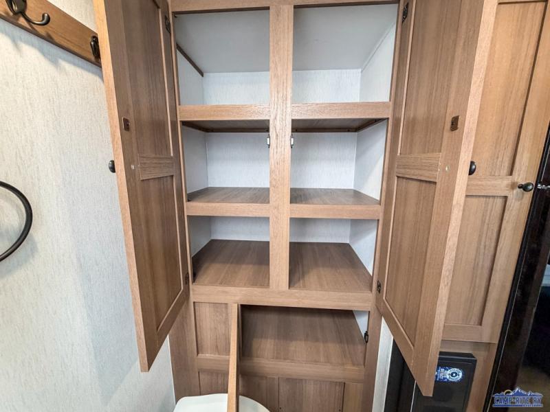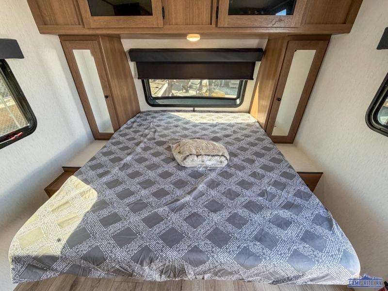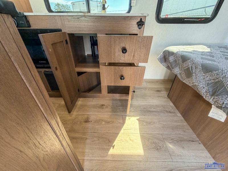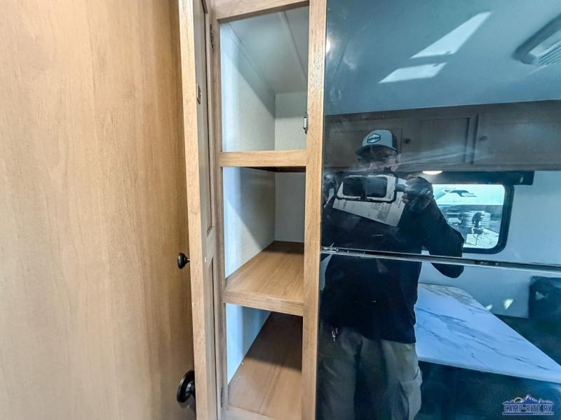 Easily head out to the campgrounds with this easy to tow trailer that offers indoor amenities to keep you fed, cleaned and relaxed! The galley kitchen provides a microwave, two burner cooktop and a pantry, plus a 10-cu. ft. 12V refrigerator all at your fingertips, and the rear full bathroom gives you a shower, wardrobe and more! You can eat your meals inside at the booth dinette which also provides sleeping space for one, and the walk-around queen-size bed up front with two wardrobes will allow you to sleep well while away from home.