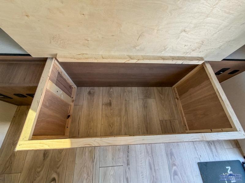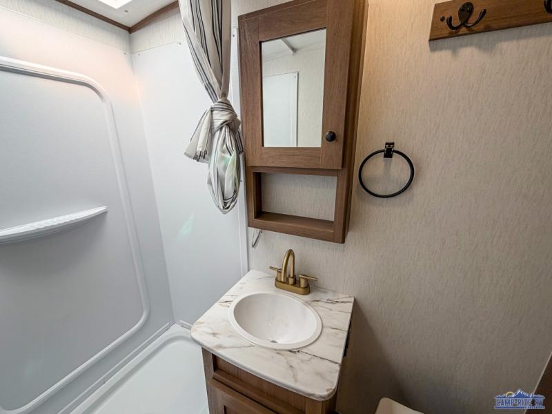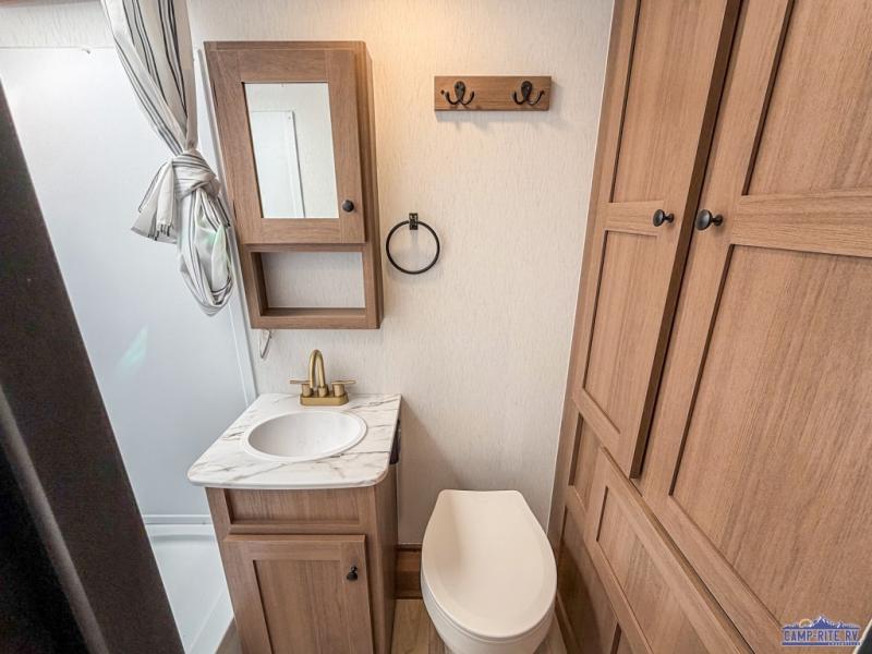 What I liked most: Quite roomy for a small camper. Plenty of storage next to the bed with 2 vertical cabinets with mirrors and 2 overhead horizontal cabinets with glass doors. Bathroom has lots of storage with 4 cabinets.