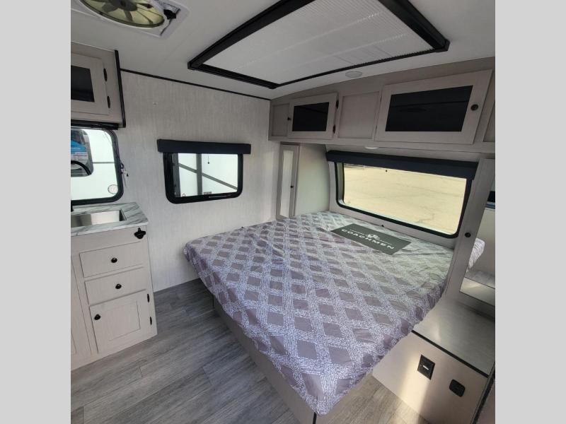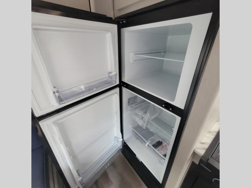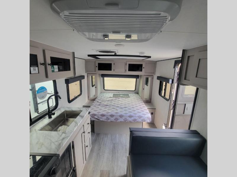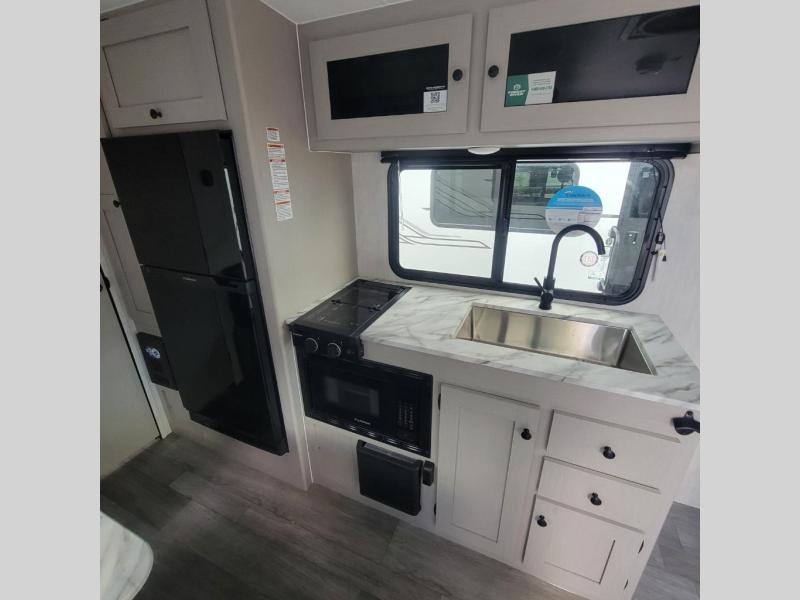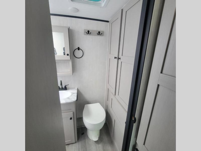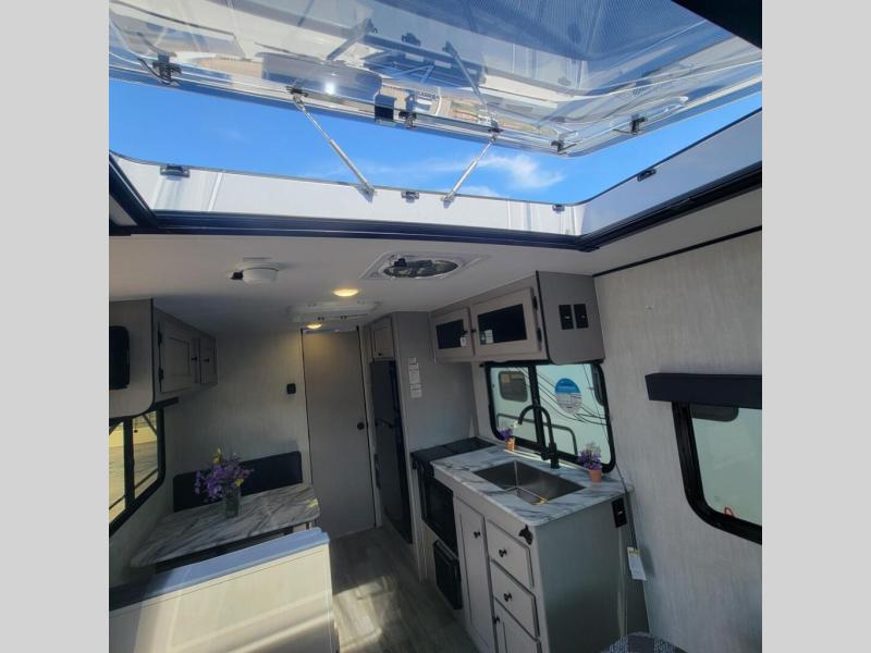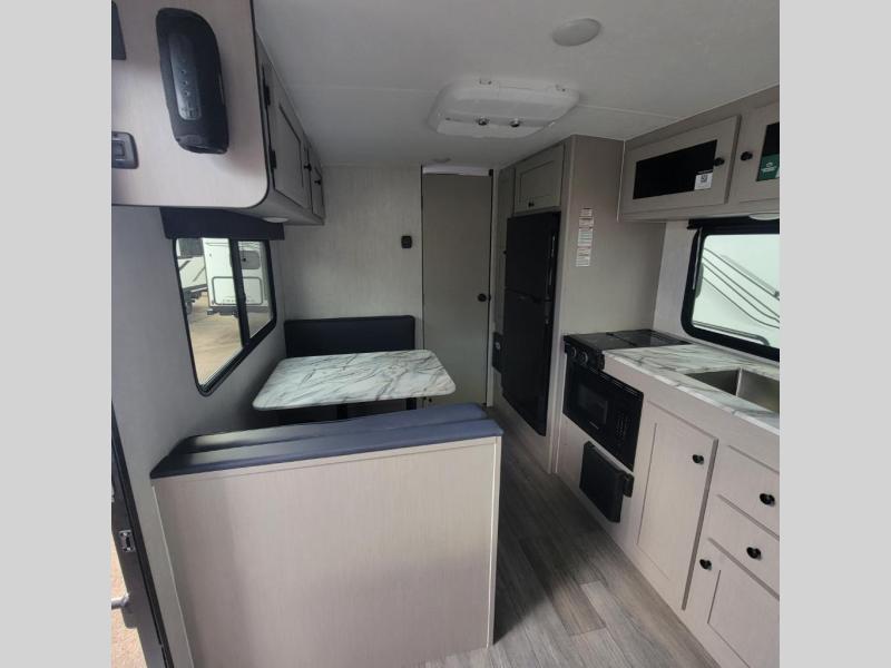 Easily head out to the campgrounds with this easy to tow trailer that offers indoor amenities to keep you fed, cleaned and relaxed! The galley kitchen provides a microwave, two burner cooktop and a pantry, plus a 10-cu. ft. 12V refrigerator all at your fingertips, and the rear full bathroom gives you a shower, wardrobe and more! You can eat your meals inside at the booth dinette which also provides sleeping space for one, and the walk-around queen-size bed up front with two wardrobes will allow you to sleep well while away from home.
