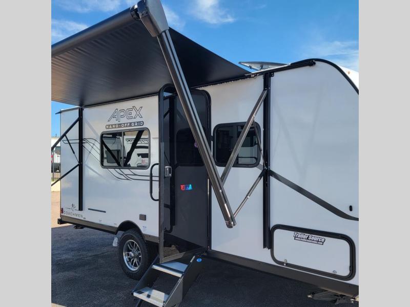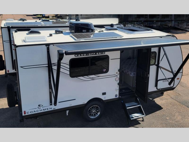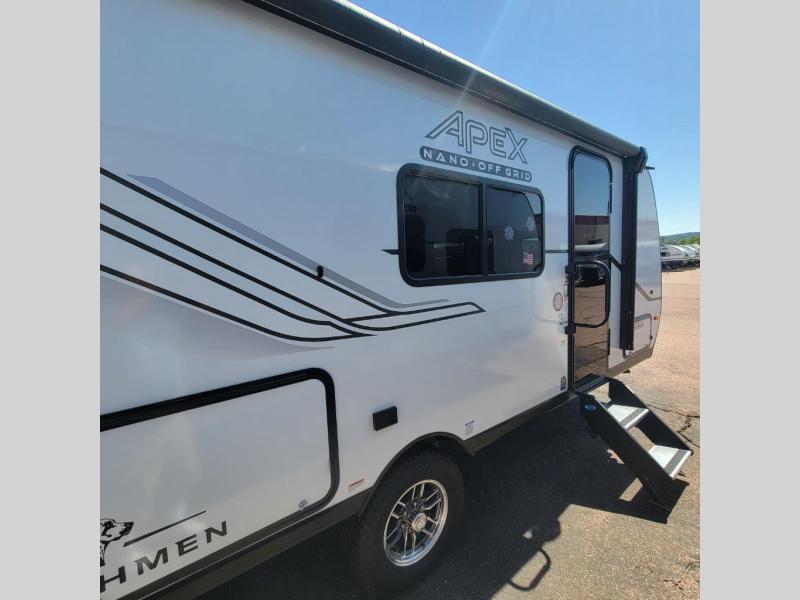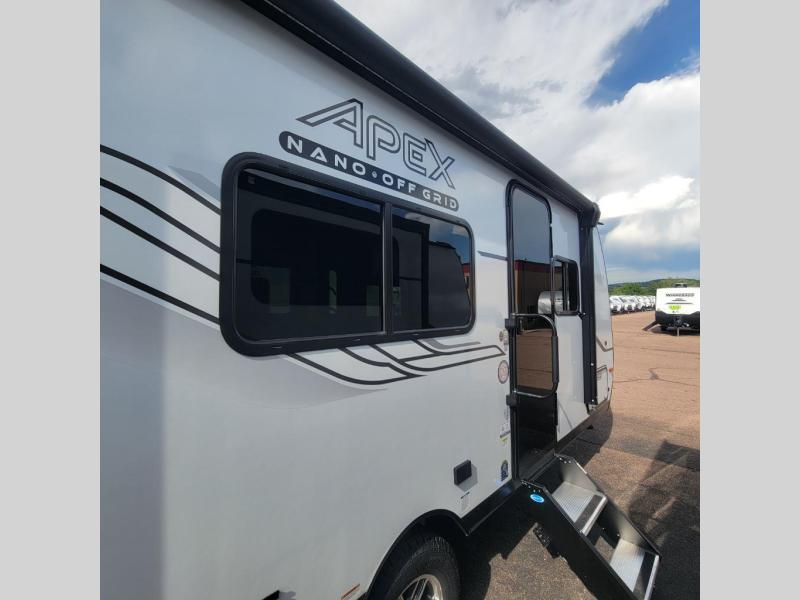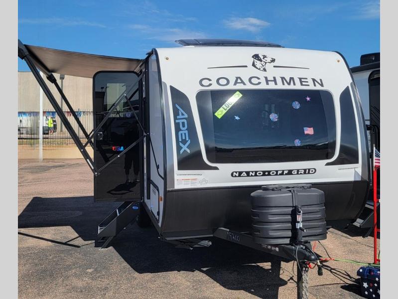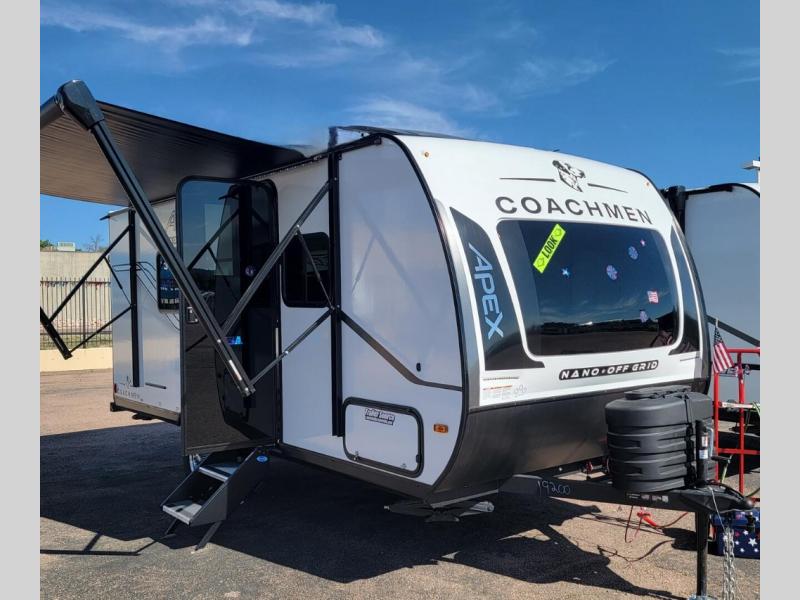 You will find comfort, convenience, and a sturdy construction with each of these Coachmen RV Apex Nano travel trailers! They are held together with an aluma-cage construction, an I-beam chassis, plus vacuum-bonded laminated dual Azdel fiberglass walls for double the protection against the elements. The 400-watt solar panel with a 30-amp control charger is included, along with two 20 lb. LP tanks, a high velocity power roof vent, plus 12V outlets to keep you powered up. More exterior features include a hot/cold shower, four stabilizer jacks, a power awning with LED lighting, and radius thumb latch baggage doors to easily pack and unload your gear. You will love the interior of your Apex Nano with Congoleum residential flooring, one-piece seamless edge countertops, matte black hardware in the galley, and a hand-crafted wood medicine cabinet in the bath.