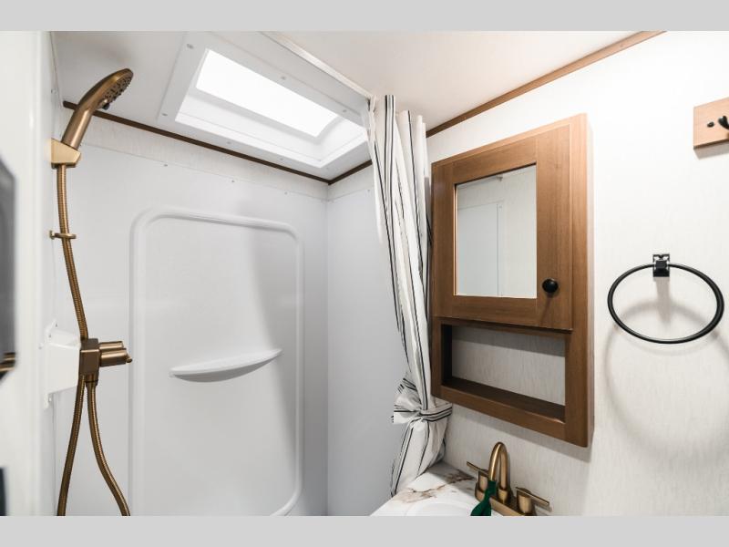 What I liked most: Quite roomy for a small camper. Plenty of storage next to the bed with 2 vertical cabinets with mirrors and 2 overhead horizontal cabinets with glass doors. Bathroom has lots of storage with 4 cabinets.