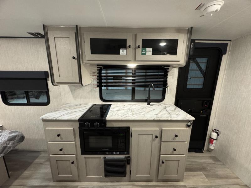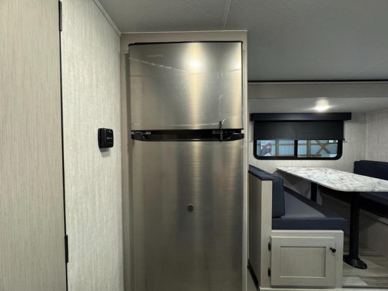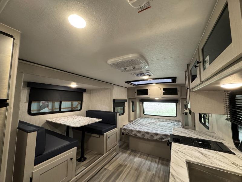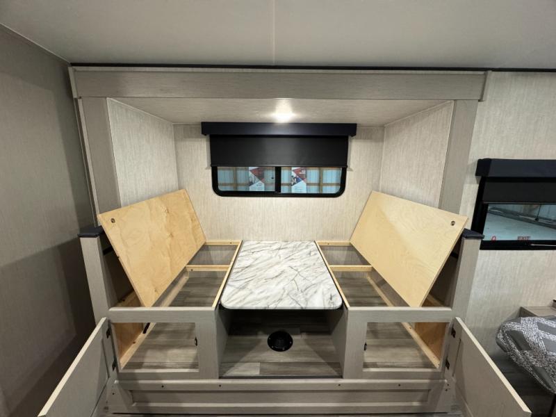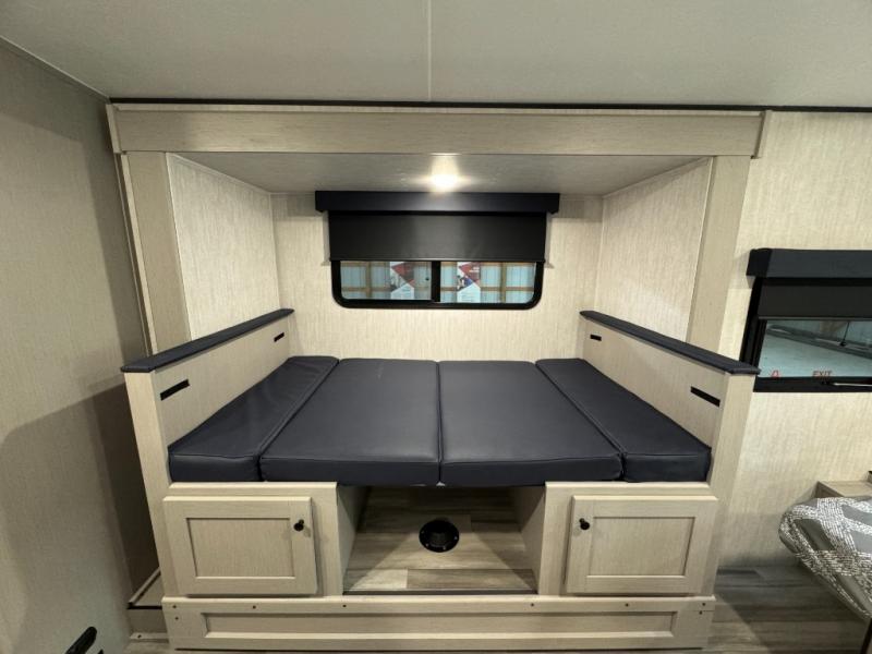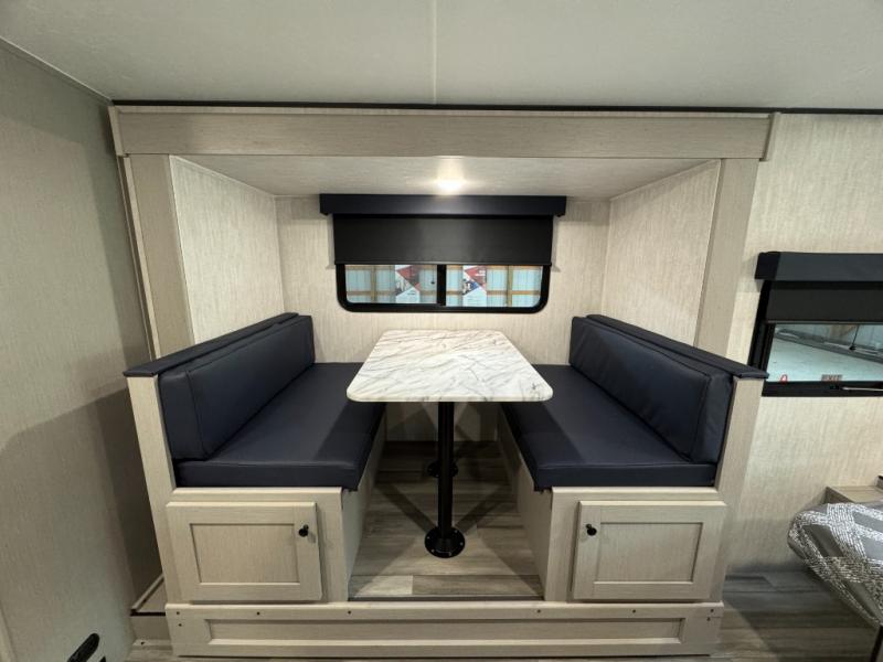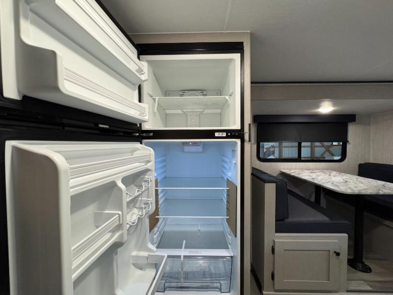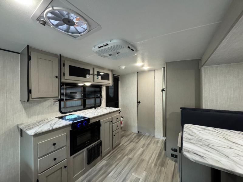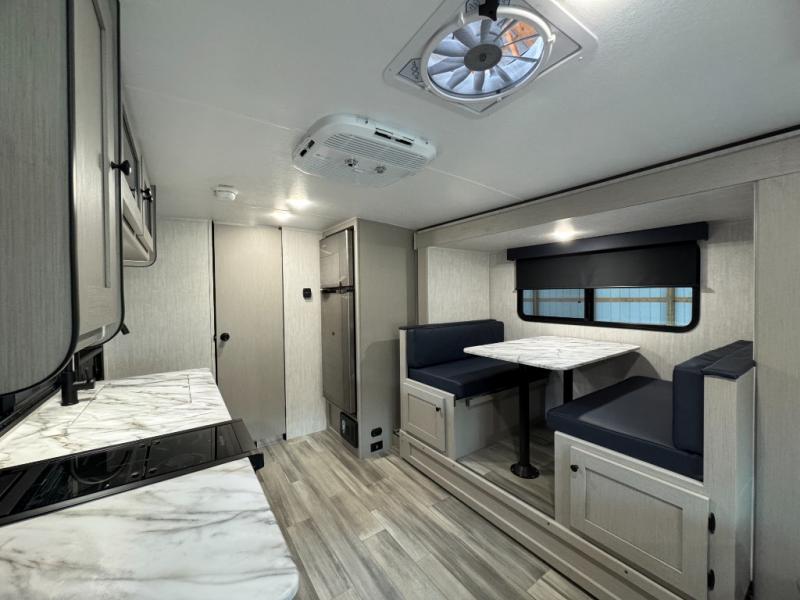 Whether you camp with friends, family or solo, this trailer gives you space for all with a spacious main living and kitchen area thanks to the booth dinette slide! The rear full bath offers a shower, sink, toilet and a wardrobe so you can get ready in privacy. A two burner cooktop and microwave underneath will let you make meals each day, and the 12V refrigerator will be perfect for perishables. The walk-around queen-size bed provides convenience when getting in and out of bed and there are two wardrobes and overhead cabinets to keep your belongings up and away. The power awning protects you from the elements when relaxing outside, and the exterior pass-through storage gives you a place to stow the outdoor equipment like camping chairs, tables, fishing poles and charcoal.
