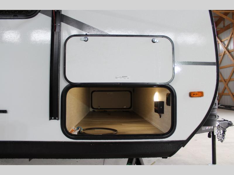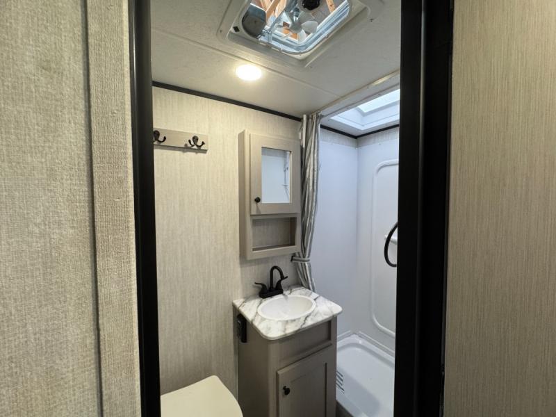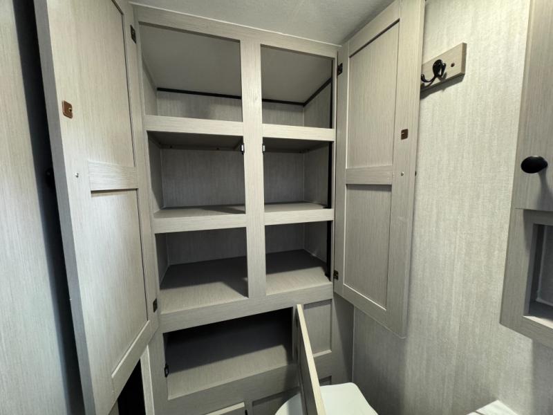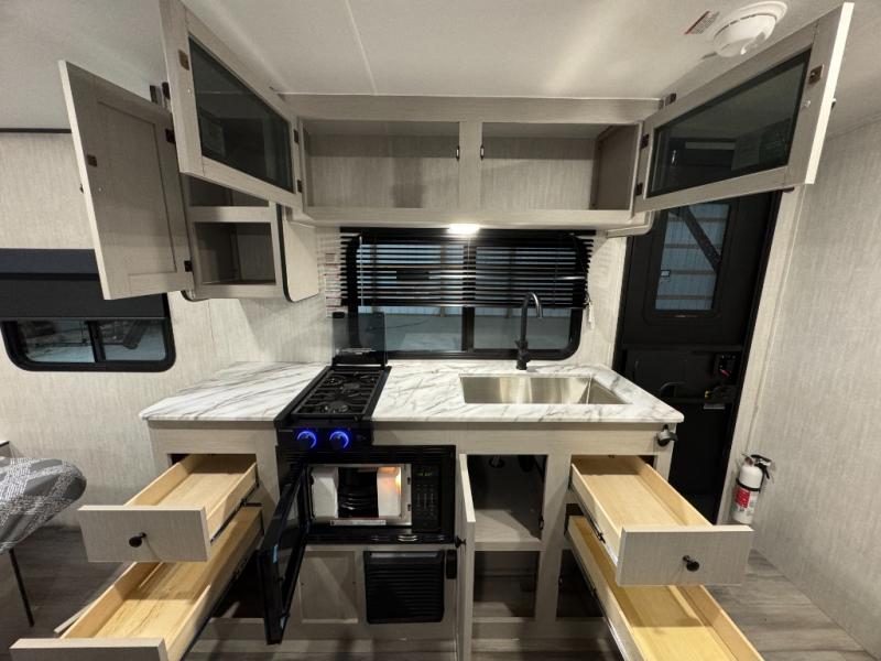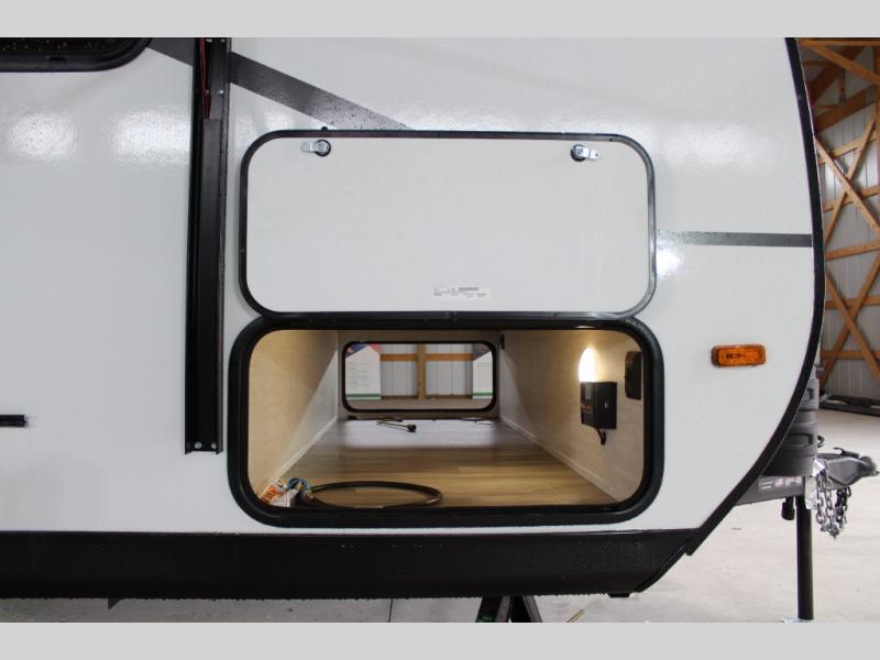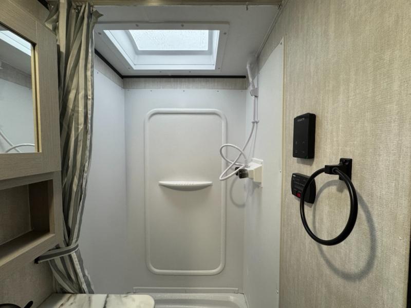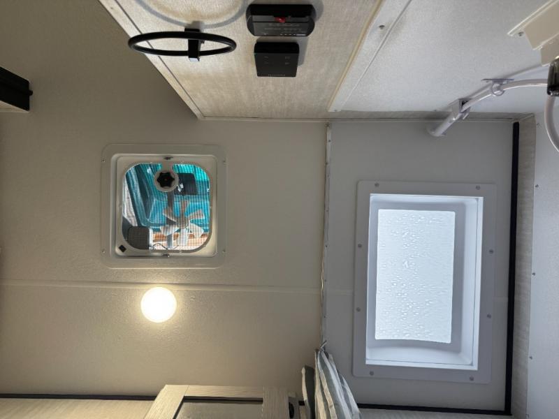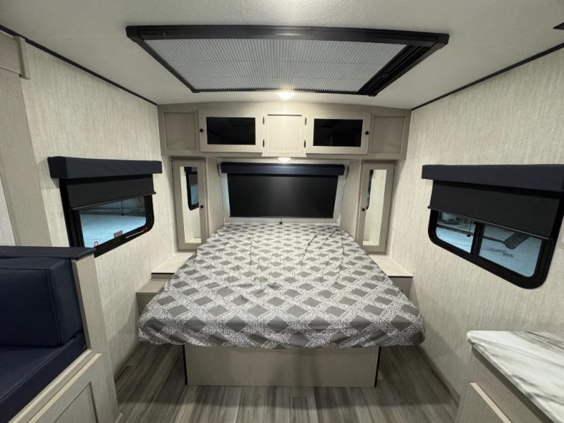 Whether you camp with friends, family or solo, this trailer gives you space for all with a spacious main living and kitchen area thanks to the booth dinette slide! The rear full bath offers a shower, sink, toilet and a wardrobe so you can get ready in privacy. A two burner cooktop and microwave underneath will let you make meals each day, and the 12V refrigerator will be perfect for perishables. The walk-around queen-size bed provides convenience when getting in and out of bed and there are two wardrobes and overhead cabinets to keep your belongings up and away. The power awning protects you from the elements when relaxing outside, and the exterior pass-through storage gives you a place to stow the outdoor equipment like camping chairs, tables, fishing poles and charcoal.