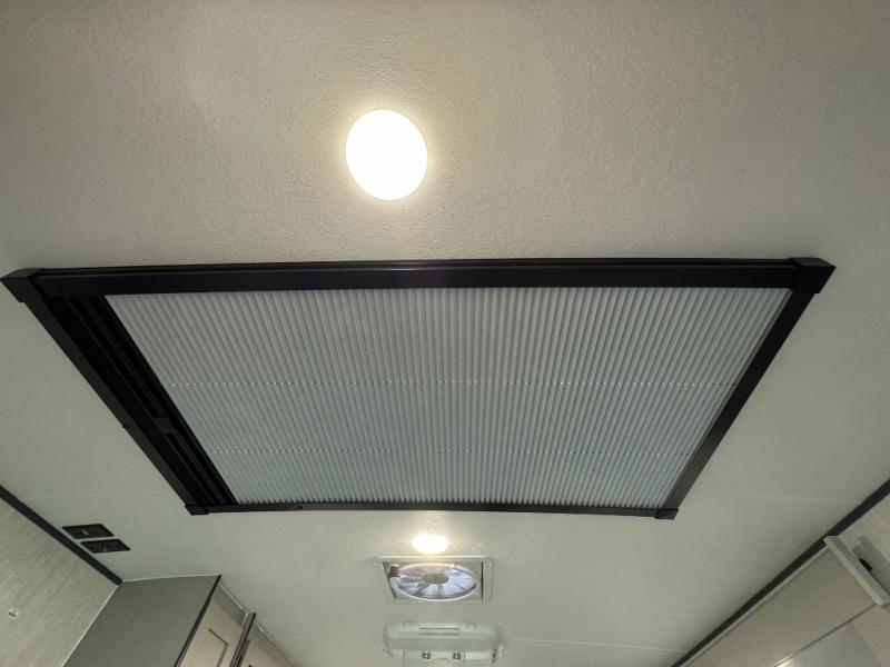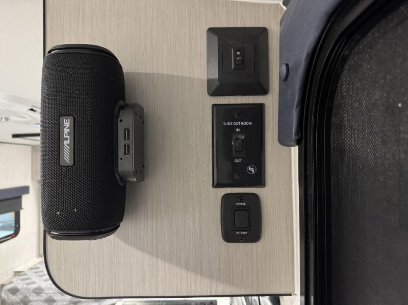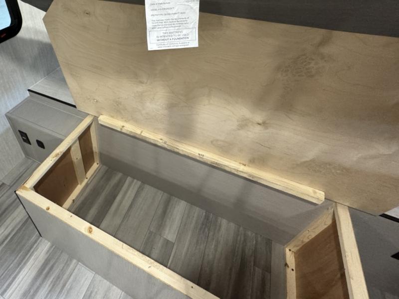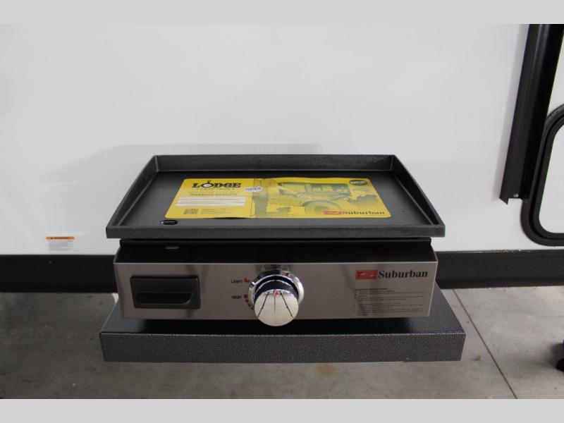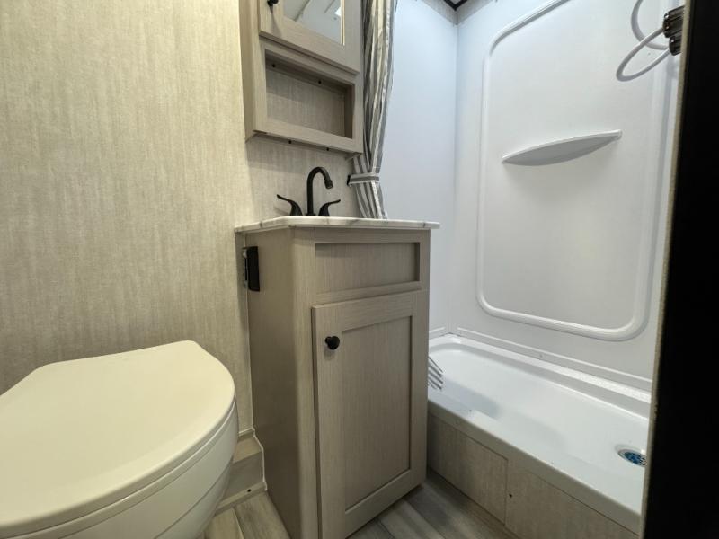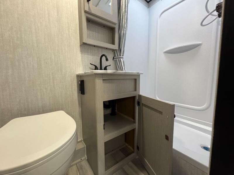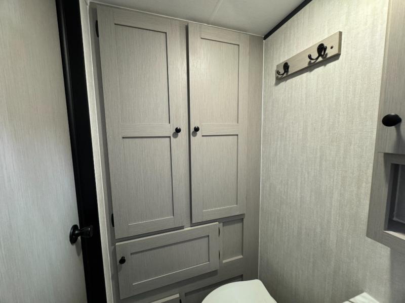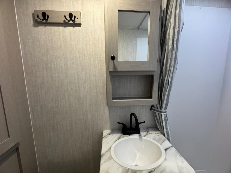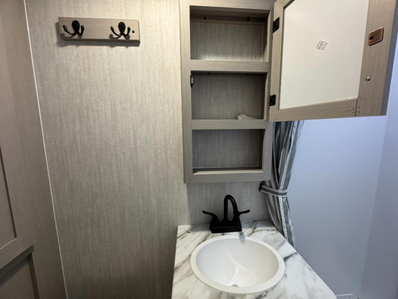 Whether you camp with friends, family or solo, this trailer gives you space for all with a spacious main living and kitchen area thanks to the booth dinette slide! The rear full bath offers a shower, sink, toilet and a wardrobe so you can get ready in privacy. A two burner cooktop and microwave underneath will let you make meals each day, and the 12V refrigerator will be perfect for perishables. The walk-around queen-size bed provides convenience when getting in and out of bed and there are two wardrobes and overhead cabinets to keep your belongings up and away. The power awning protects you from the elements when relaxing outside, and the exterior pass-through storage gives you a place to stow the outdoor equipment like camping chairs, tables, fishing poles and charcoal.