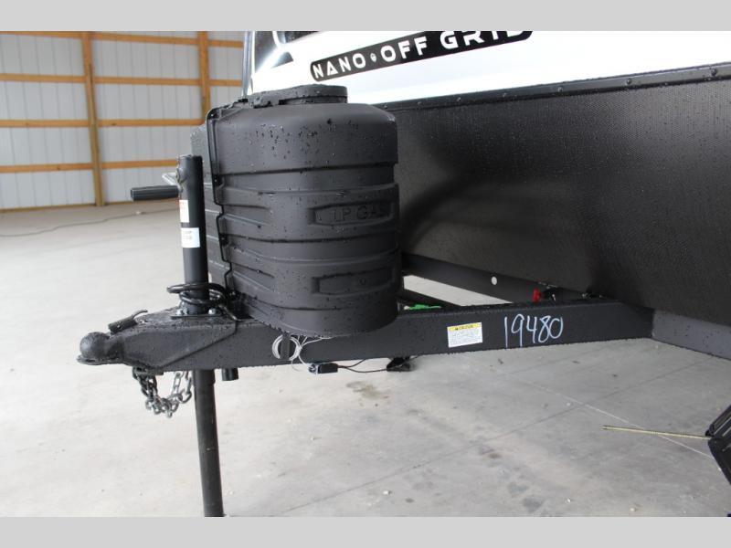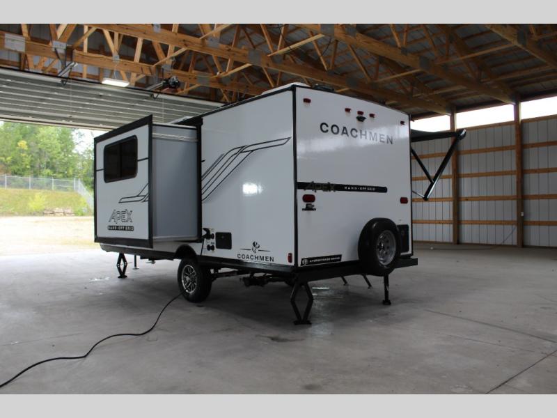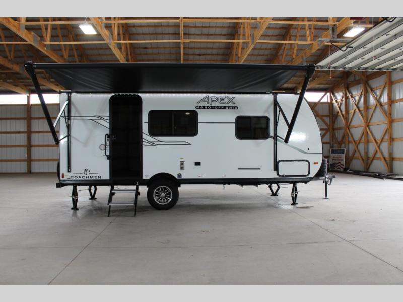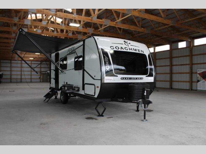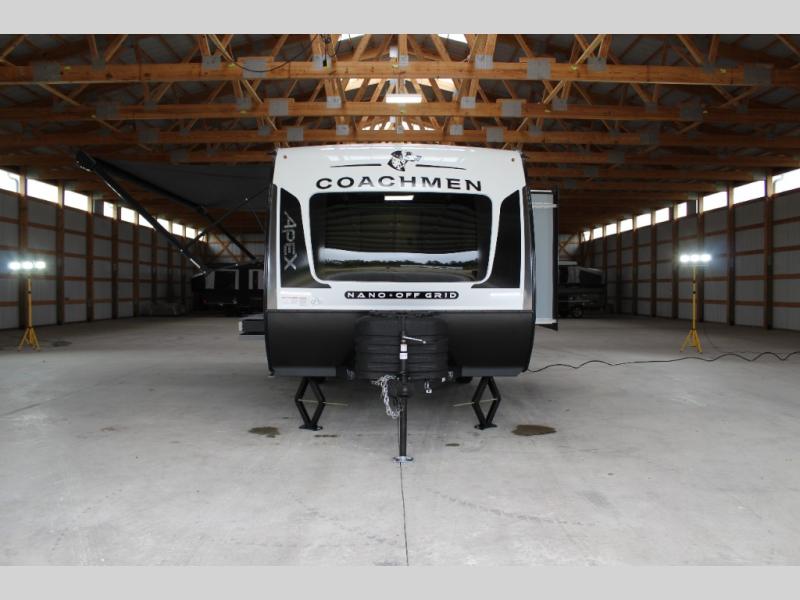 You will find comfort, convenience, and a sturdy construction with each of these Coachmen RV Apex Nano travel trailers! They are held together with an aluma-cage construction, an I-beam chassis, plus vacuum-bonded laminated dual Azdel fiberglass walls for double the protection against the elements. The 200-watt solar panel with a 30 amp control charger is included within the Off-Grid Package, along with two 20 lb. LP tanks, a high velocity power roof vent, plus 12V outlets to keep you powered up. More exterior feature include a hot/cold shower, four stabilizer jacks, a power awning with LED lighting, and magnetic baggage door catches to easily pack and unload your gear. You will love the interior of your Apex Nano with Congoleum residential flooring, one-piece seamless edge countertops, matte black hardware in the galley, and a hand-crafted wood medicine cabinet in the bath.