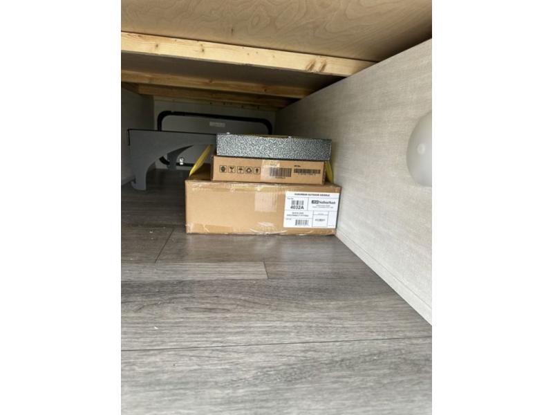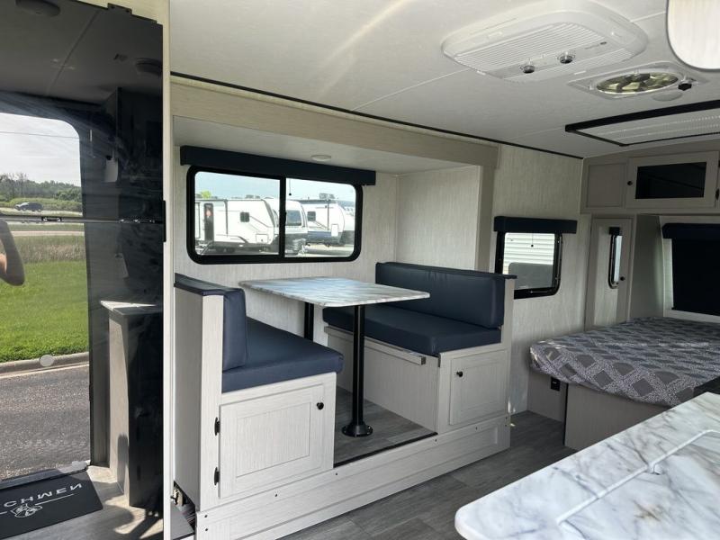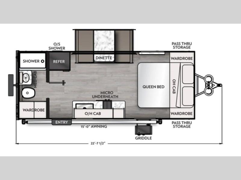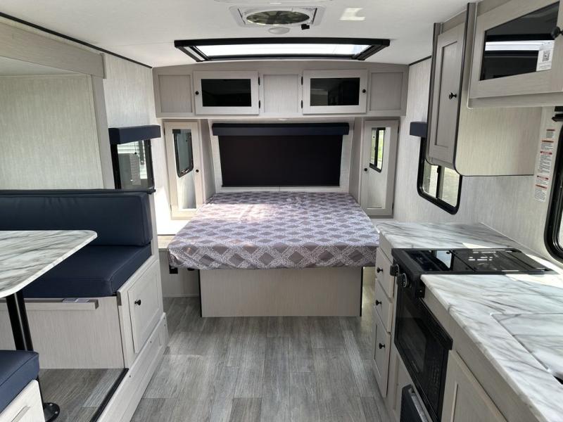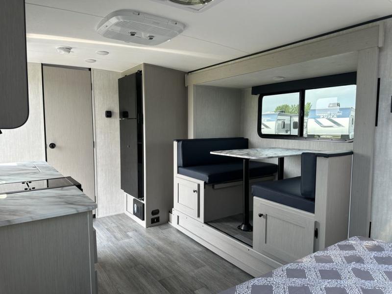 Whether you camp with friends, family or solo, this trailer gives you space for all with a spacious main living and kitchen area thanks to the booth dinette slide! The rear full bath offers a shower, sink, toilet and a wardrobe so you can get ready in privacy. A two burner cooktop and microwave underneath will let you make meals each day, and the 12V refrigerator will be perfect for perishables. The walk-around queen-size bed provides convenience when getting in and out of bed and there are two wardrobes and overhead cabinets to keep your belongings up and away. The power awning protects you from the elements when relaxing outside, and the exterior pass-through storage gives you a place to stow the outdoor equipment like camping chairs, tables, fishing poles and charcoal.