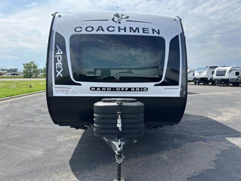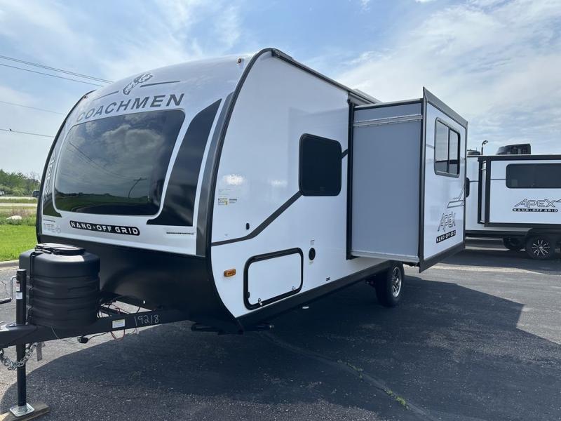 You will find comfort, convenience, and a sturdy construction with each of these Coachmen RV Apex Nano travel trailers! They are held together with an aluma-cage construction, an I-beam chassis, plus vacuum-bonded laminated dual Azdel fiberglass walls for double the protection against the elements. The 200-watt solar panel with a 30 amp control charger is included within the Off-Grid Package, along with two 20 lb. LP tanks, a high velocity power roof vent, plus 12V outlets to keep you powered up. More exterior feature include a hot/cold shower, four stabilizer jacks, a power awning with LED lighting, and magnetic baggage door catches to easily pack and unload your gear. You will love the interior of your Apex Nano with Congoleum residential flooring, one-piece seamless edge countertops, matte black hardware in the galley, and a hand-crafted wood medicine cabinet in the bath.