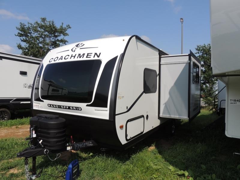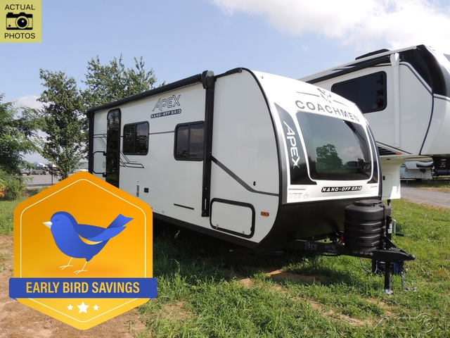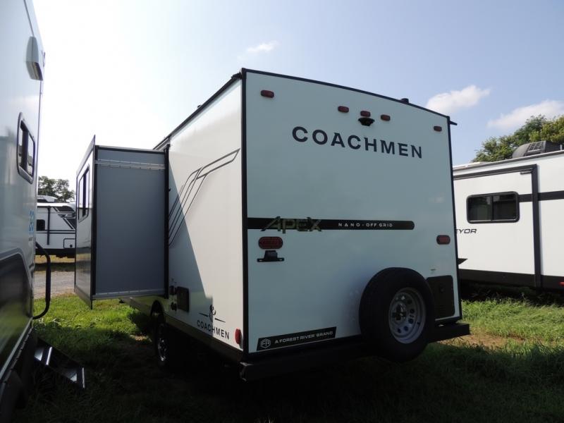 You will find comfort, convenience, and a sturdy construction with each of these Coachmen RV Apex Nano travel trailers! They are held together with an aluma-cage construction, an I-beam chassis, plus vacuum-bonded laminated dual Azdel fiberglass walls for double the protection against the elements. The 200-watt solar panel with a 30 amp control charger is included within the Off-Grid Package, along with two 20 lb. LP tanks, a high velocity power roof vent, plus 12V outlets to keep you powered up. More exterior feature include a hot/cold shower, four stabilizer jacks, a power awning with LED lighting, and magnetic baggage door catches to easily pack and unload your gear. You will love the interior of your Apex Nano with Congoleum residential flooring, one-piece seamless edge countertops, matte black hardware in the galley, and a hand-crafted wood medicine cabinet in the bath.