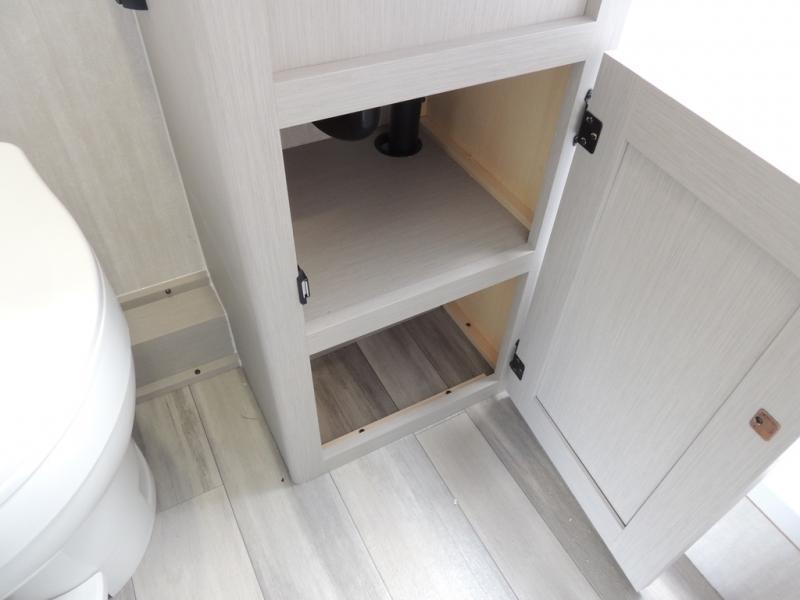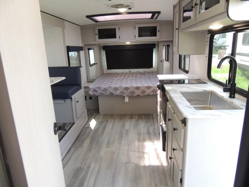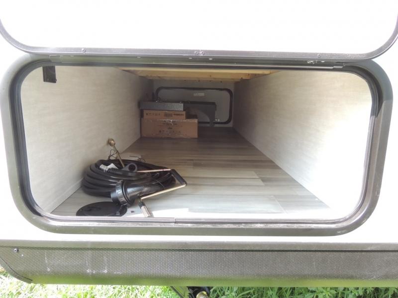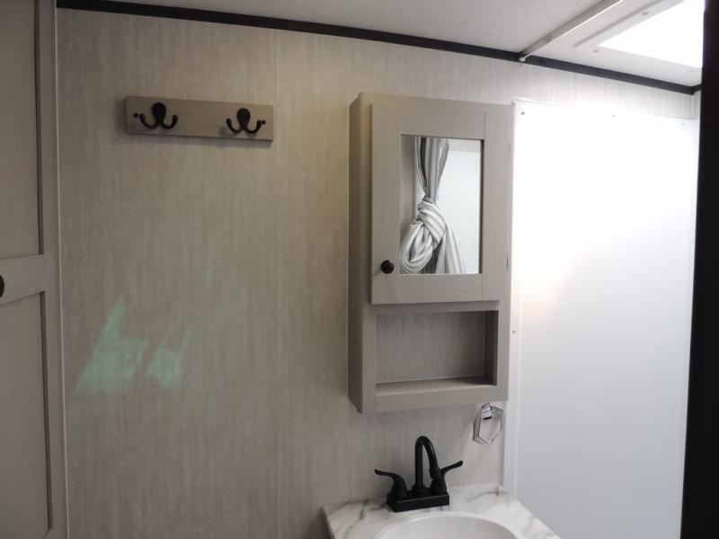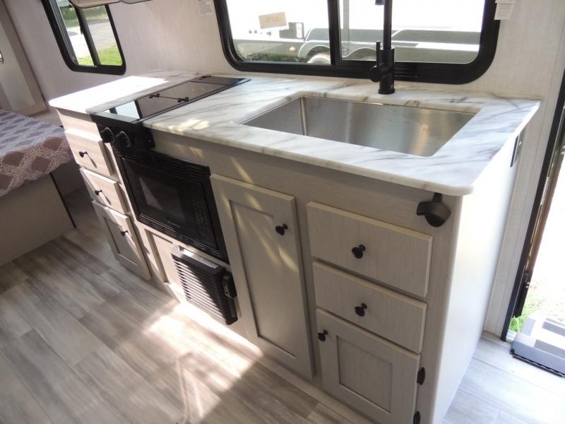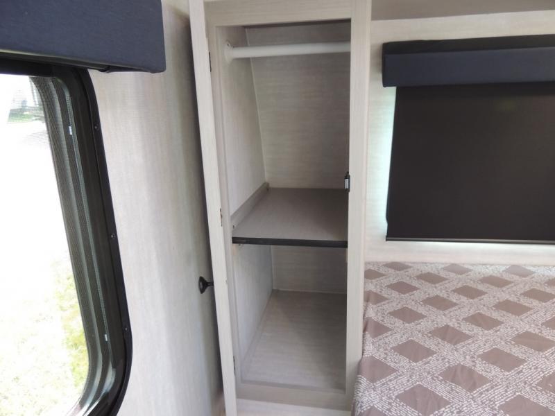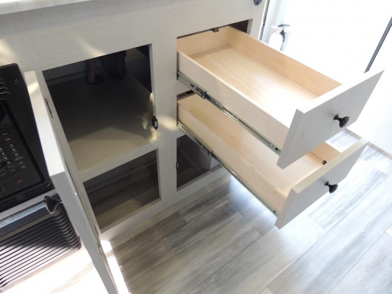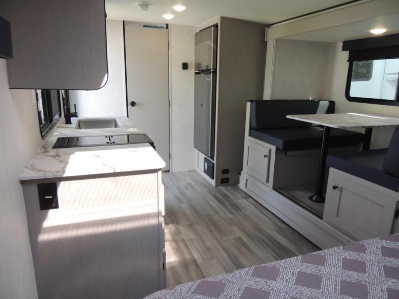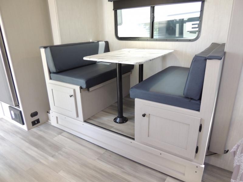 Whether you camp with friends, family or solo, this trailer gives you space for all with a spacious main living and kitchen area thanks to the booth dinette slide! The rear full bath offers a shower, sink, toilet and a wardrobe so you can get ready in privacy. A two burner cooktop and microwave underneath will let you make meals each day, and the 12V refrigerator will be perfect for perishables. The walk-around queen-size bed provides convenience when getting in and out of bed and there are two wardrobes and overhead cabinets to keep your belongings up and away. The power awning protects you from the elements when relaxing outside, and the exterior pass-through storage gives you a place to stow the outdoor equipment like camping chairs, tables, fishing poles and charcoal.