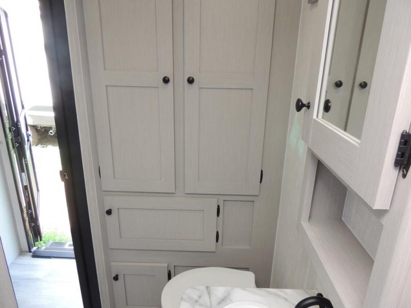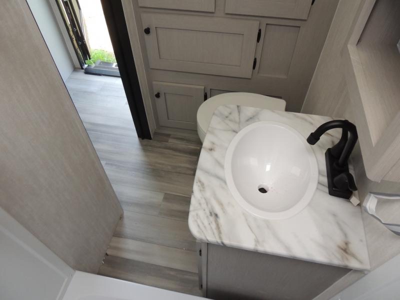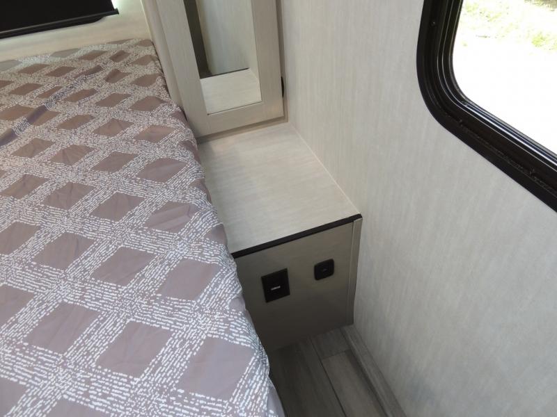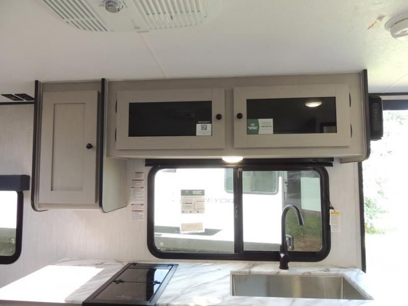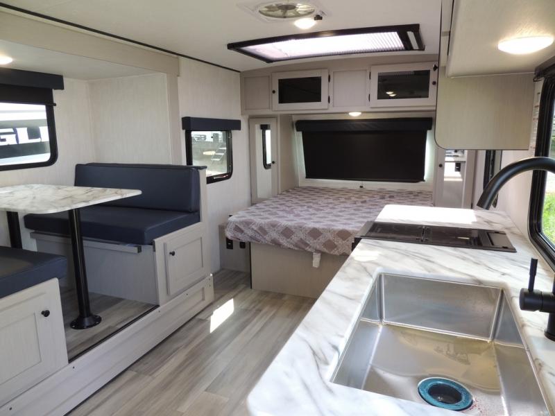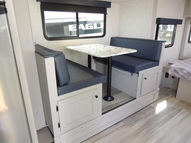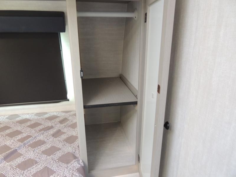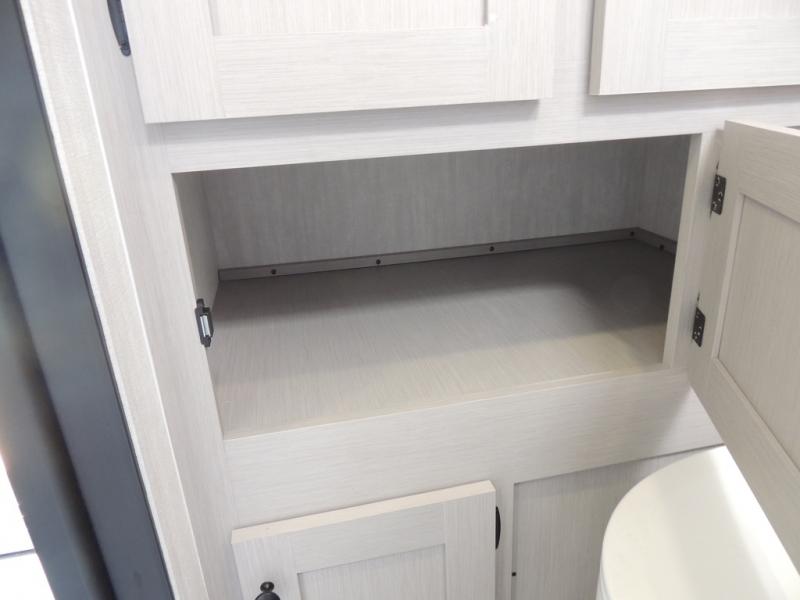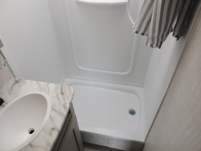 Whether you camp with friends, family or solo, this trailer gives you space for all with a spacious main living and kitchen area thanks to the booth dinette slide! The rear full bath offers a shower, sink, toilet and a wardrobe so you can get ready in privacy. A two burner cooktop and microwave underneath will let you make meals each day, and the 12V refrigerator will be perfect for perishables. The walk-around queen-size bed provides convenience when getting in and out of bed and there are two wardrobes and overhead cabinets to keep your belongings up and away. The power awning protects you from the elements when relaxing outside, and the exterior pass-through storage gives you a place to stow the outdoor equipment like camping chairs, tables, fishing poles and charcoal.