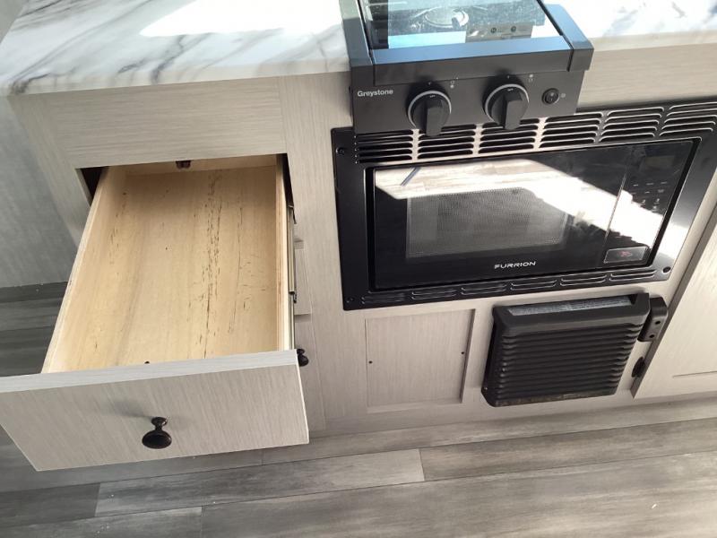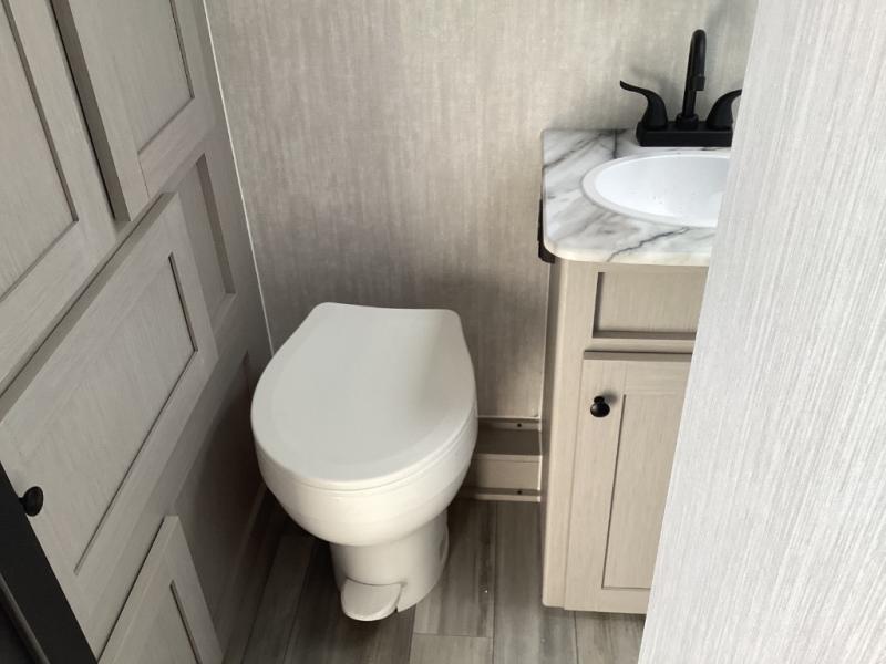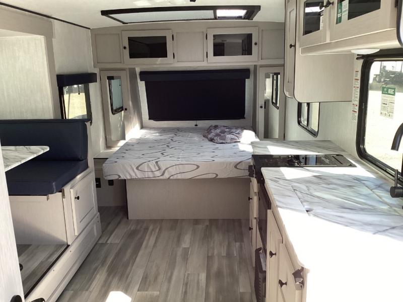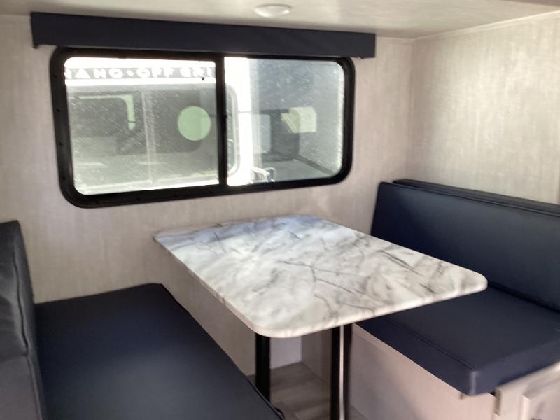 Features clean-lined countertops, smart cabinetry, stellar 8 cu. ft. 12V fridge, digital antenna/WiFi-ready, and a booth dinette or sofa suite for flexible living space. -