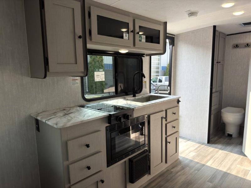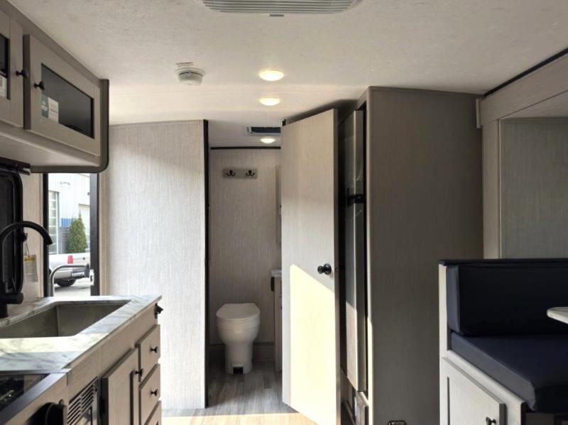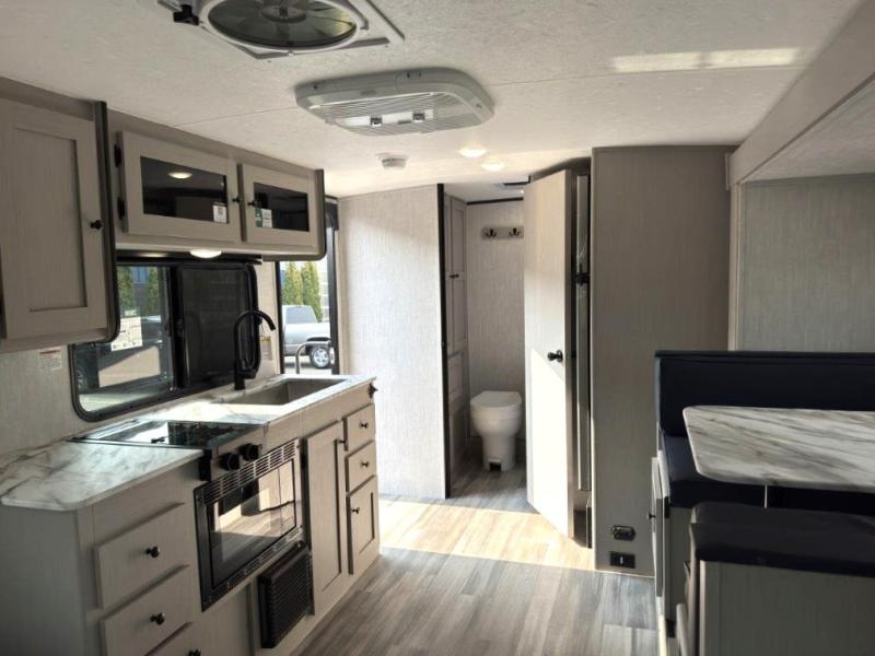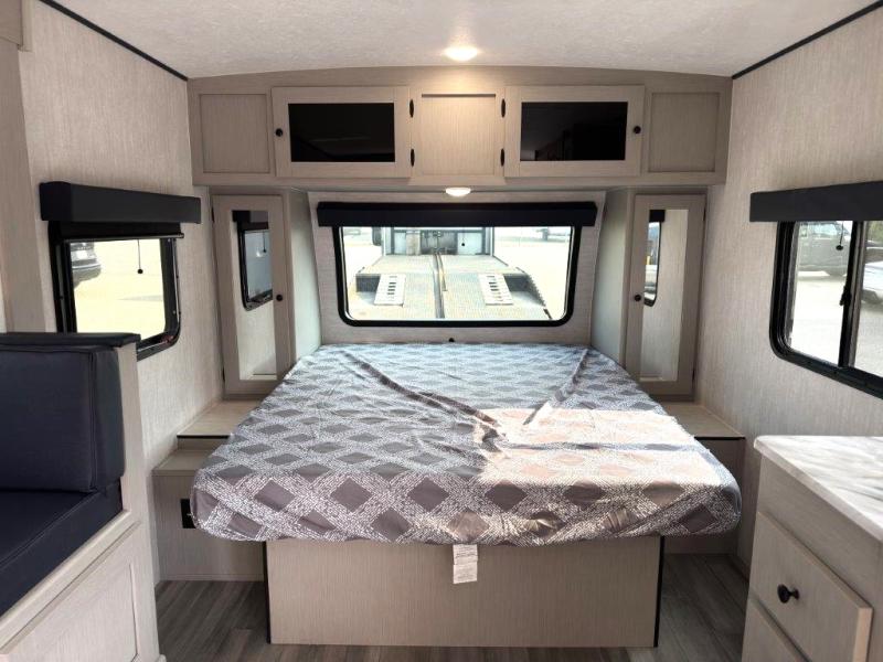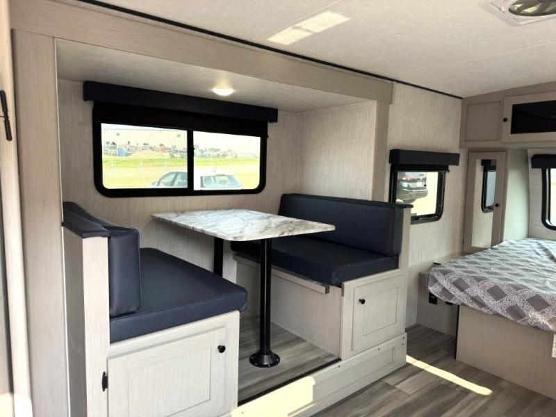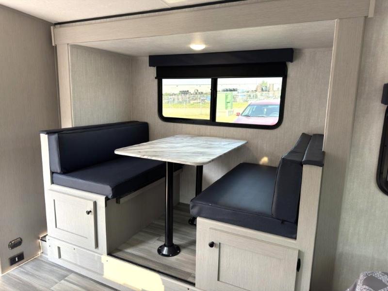 Whether you camp with friends, family or solo, this trailer gives you space for all with a spacious main living and kitchen area thanks to the booth dinette slide! The rear full bath offers a shower, sink, toilet and a wardrobe so you can get ready in privacy. A two burner cooktop and microwave underneath will let you make meals each day, and the 12V refrigerator will be perfect for perishables. The walk-around queen-size bed provides convenience when getting in and out of bed and there are two wardrobes and overhead cabinets to keep your belongings up and away. The power awning protects you from the elements when relaxing outside, and the exterior pass-through storage gives you a place to stow the outdoor equipment like camping chairs, tables, fishing poles and charcoal.