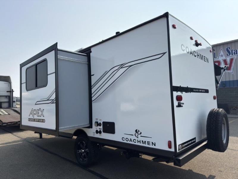 You will find comfort, convenience, and a sturdy construction with each of these Coachmen RV Apex Nano travel trailers! They are held together with an aluma-cage construction, an I-beam chassis, plus vacuum-bonded laminated dual Azdel fiberglass walls for double the protection against the elements. The 200-watt solar panel with a 30 amp control charger is included within the Off-Grid Package, along with two 20 lb. LP tanks, a high velocity power roof vent, plus 12V outlets to keep you powered up. More exterior feature include a hot/cold shower, four stabilizer jacks, a power awning with LED lighting, and magnetic baggage door catches to easily pack and unload your gear. You will love the interior of your Apex Nano with Congoleum residential flooring, one-piece seamless edge countertops, matte black hardware in the galley, and a hand-crafted wood medicine cabinet in the bath.