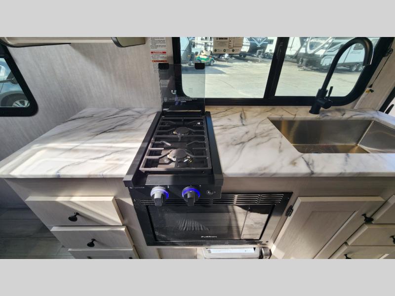 Fully equipped kitchen – 2-burner cooktop, microwave, 12V fridge