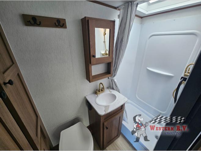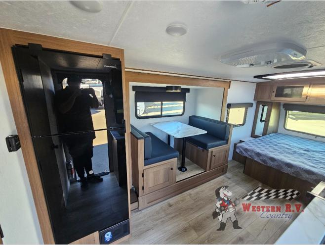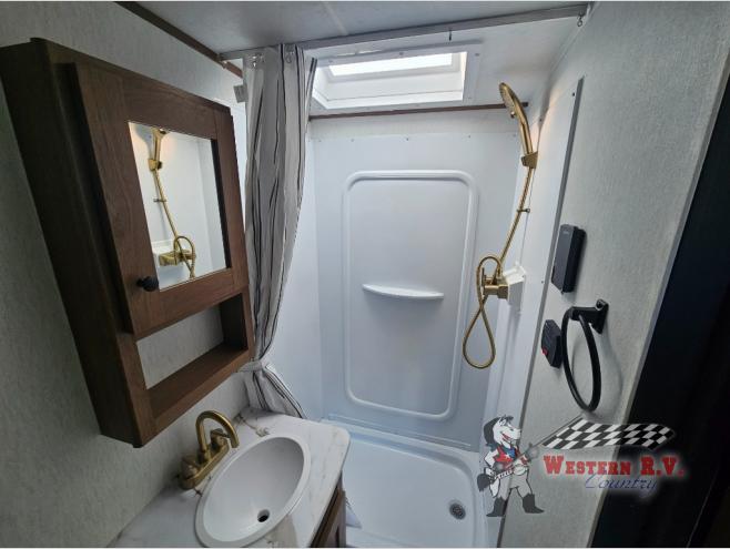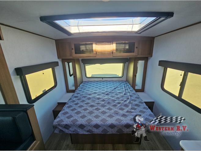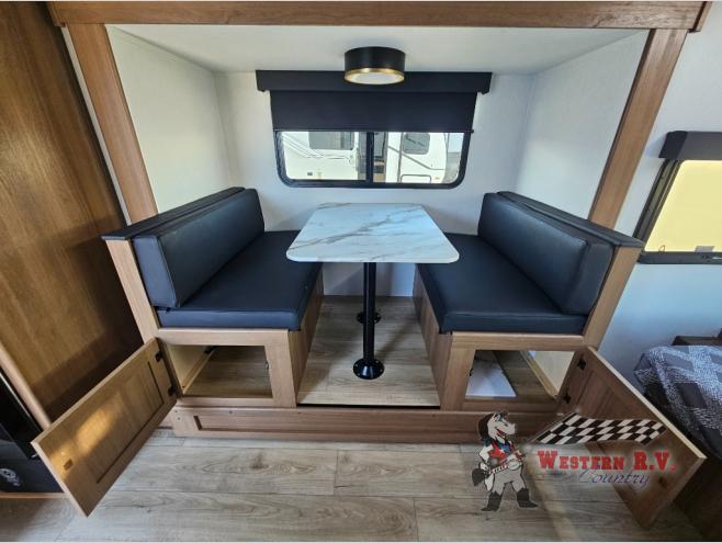 Whether you camp with friends, family or solo, this trailer gives you space for all with a spacious main living and kitchen area thanks to the booth dinette slide! The rear full bath offers a shower, sink, toilet and a wardrobe so you can get ready in privacy. A two burner cooktop and microwave underneath will let you make meals each day, and the 12V refrigerator will be perfect for perishables. The walk-around queen-size bed provides convenience when getting in and out of bed and there are two wardrobes and overhead cabinets to keep your belongings up and away. The power awning protects you from the elements when relaxing outside, and the exterior pass-through storage gives you a place to stow the outdoor equipment like camping chairs, tables, fishing poles and charcoal.
