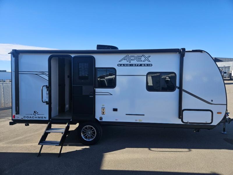 You will find comfort, convenience, and a sturdy construction with each of these Coachmen RV Apex Nano travel trailers! They are held together with an aluma-cage construction, an I-beam chassis, plus vacuum-bonded laminated dual Azdel fiberglass walls for double the protection against the elements. The 400-watt solar panel with a 30 amp control charger is included, along with two 20 lb. LP tanks, a high velocity power roof vent, plus 12V outlets to keep you powered up. More exterior features include a hot/cold shower, four stabilizer jacks, a power awning with LED lighting, and radius thumb latch baggage doors to easily pack and unload your gear. You will love the interior of your Apex Nano with Congoleum residential flooring, one-piece seamless edge countertops, matte black hardware in the galley, and a hand-crafted wood medicine cabinet in the bath.
