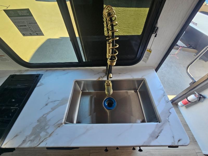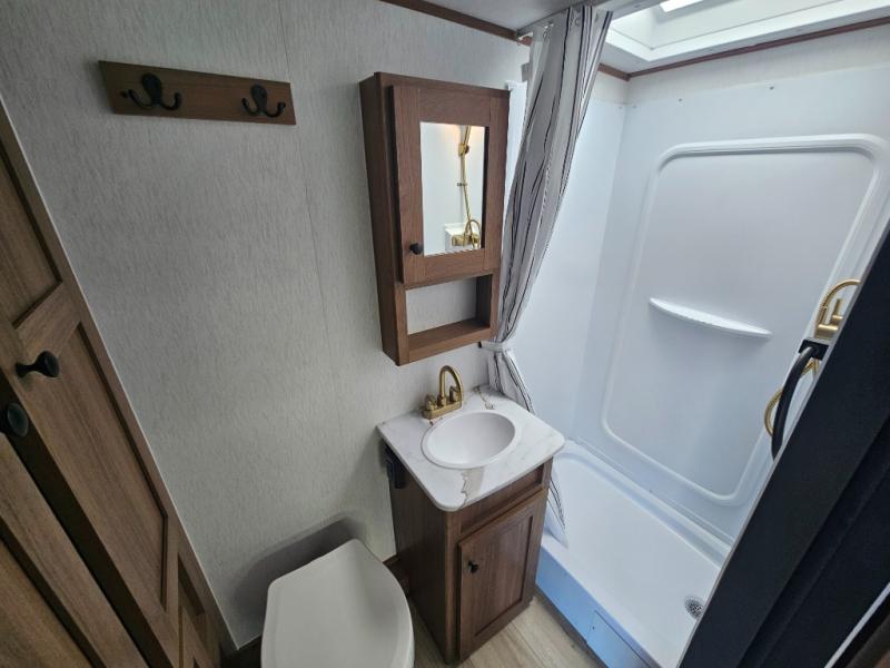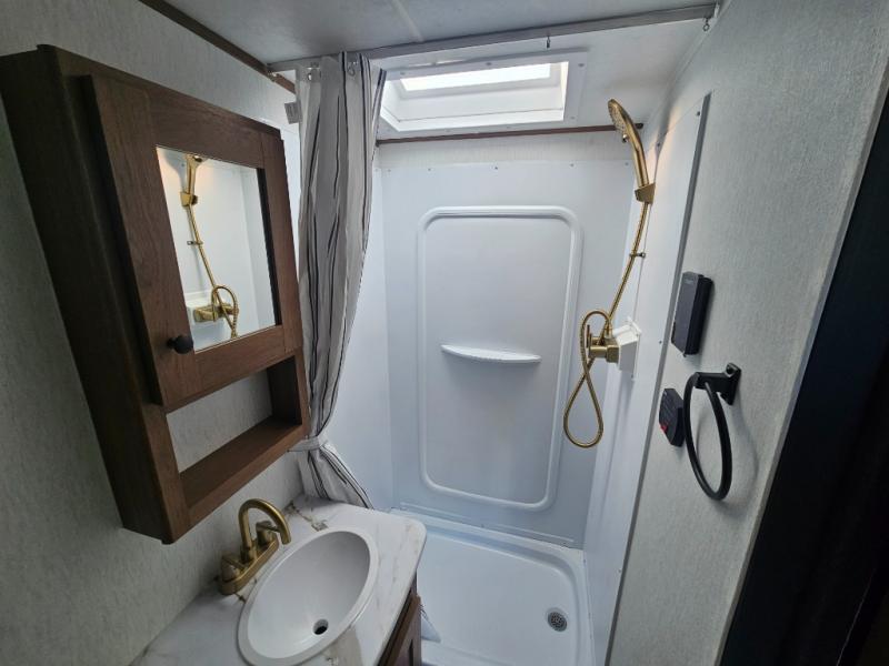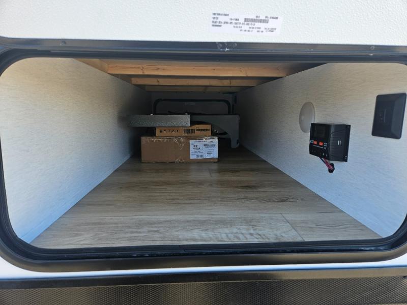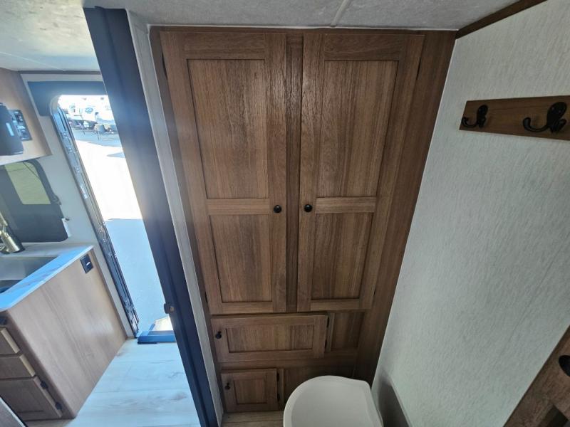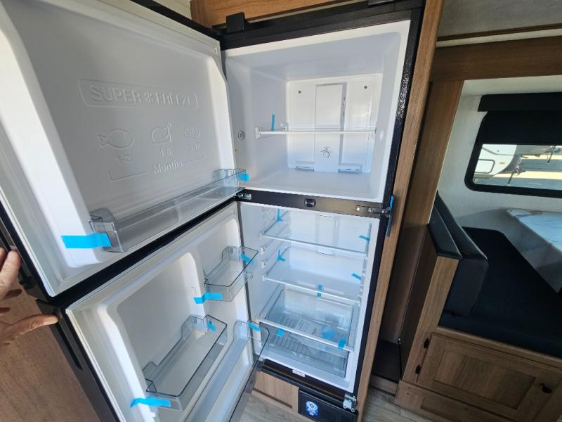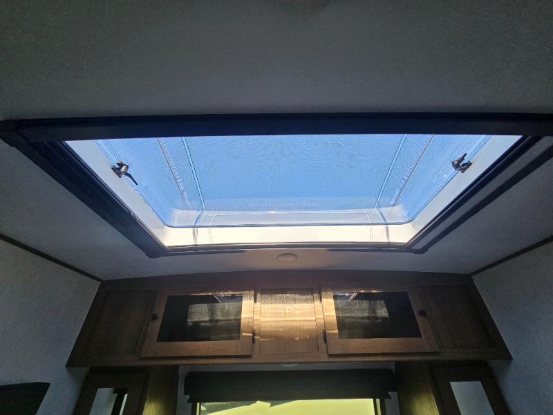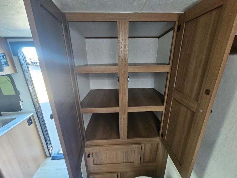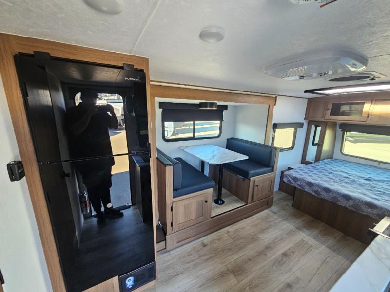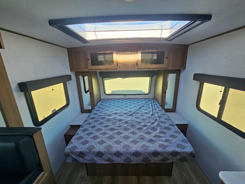 Whether you camp with friends, family or solo, this trailer gives you space for all with a spacious main living and kitchen area thanks to the booth dinette slide! The rear full bath offers a shower, sink, toilet and a wardrobe so you can get ready in privacy. A two-burner cooktop and microwave underneath will let you make meals each day, and the 12V refrigerator will be perfect for perishables. The walk-around queen-size bed provides convenience when getting in and out of bed and there are two wardrobes and overhead cabinets to keep your belongings up and away. The power awning protects you from the elements when relaxing outside, and the exterior pass-through storage gives you a place to stow the outdoor equipment like camping chairs, tables, fishing poles and charcoal.