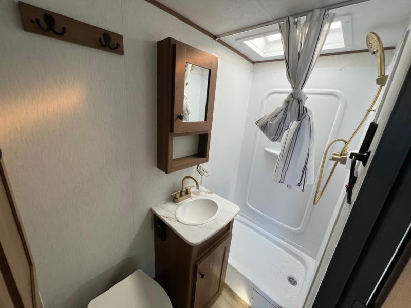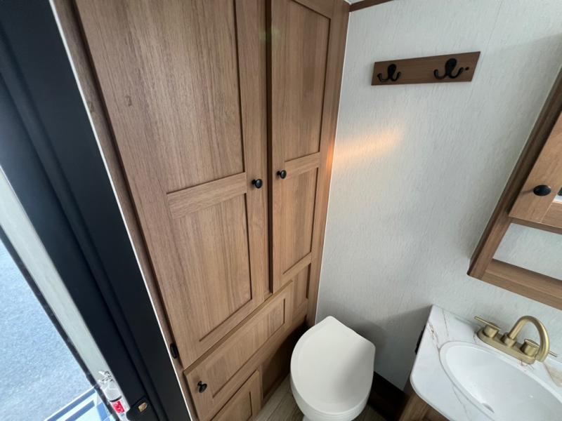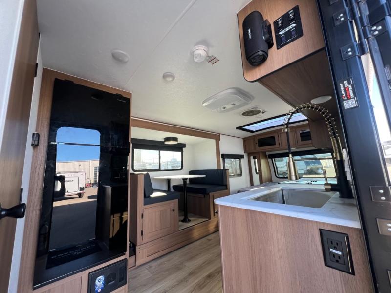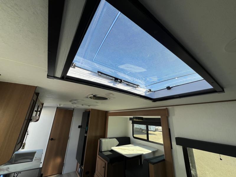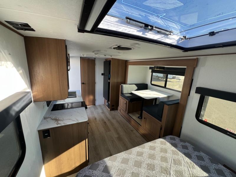 Whether you camp with friends, family or solo, this trailer gives you space for all with a spacious main living and kitchen area thanks to the booth dinette slide! The rear full bath offers a shower, sink, toilet and a wardrobe so you can get ready in privacy. A two burner cooktop and microwave underneath will let you make meals each day, and the 12V refrigerator will be perfect for perishables. The walk-around queen-size bed provides convenience when getting in and out of bed and there are two wardrobes and overhead cabinets to keep your belongings up and away. The power awning protects you from the elements when relaxing outside, and the exterior pass-through storage gives you a place to stow the outdoor equipment like camping chairs, tables, fishing poles and charcoal.