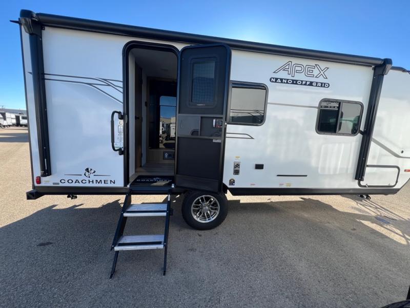 You will find comfort, convenience, and a sturdy construction with each of these Coachmen RV Apex Nano travel trailers! They are held together with an aluma-cage construction, an I-beam chassis, plus vacuum-bonded laminated dual Azdel fiberglass walls for double the protection against the elements. The 200-watt solar panel with a 30 amp control charger is included within the Off-Grid Package, along with two 20 lb. LP tanks, a high velocity power roof vent, plus 12V outlets to keep you powered up. More exterior feature include a hot/cold shower, four stabilizer jacks, a power awning with LED lighting, and magnetic baggage door catches to easily pack and unload your gear. You will love the interior of your Apex Nano with Congoleum residential flooring, one-piece seamless edge countertops, matte black hardware in the galley, and a hand-crafted wood medicine cabinet in the bath.