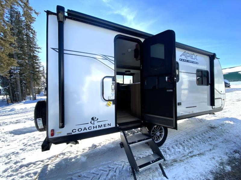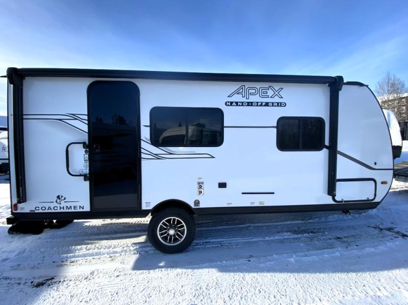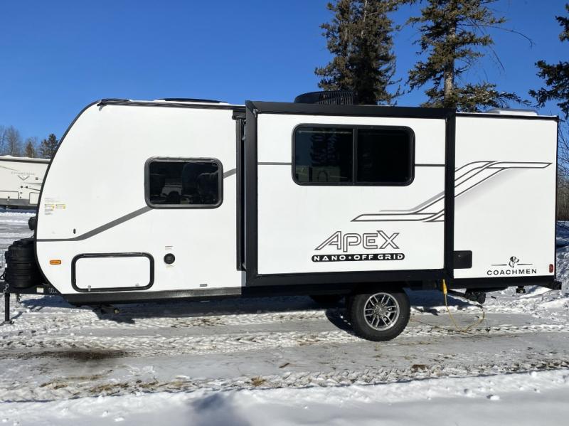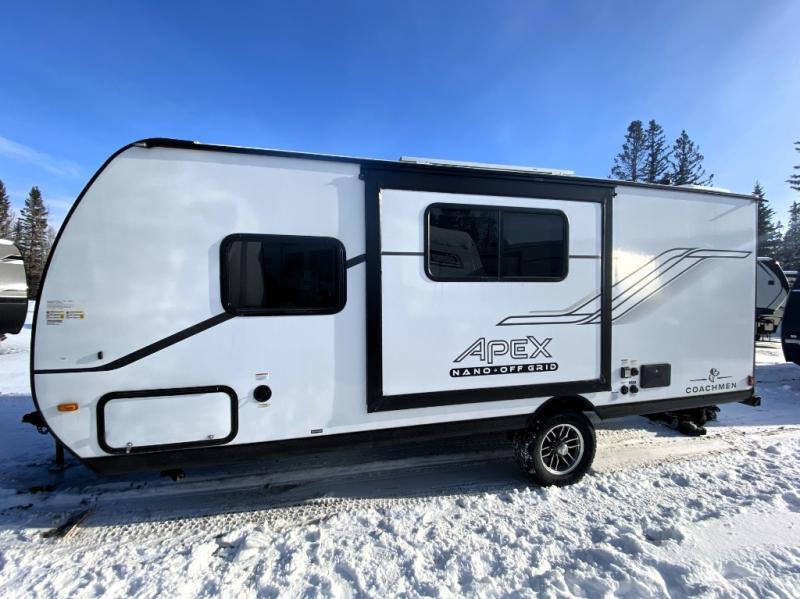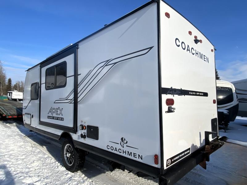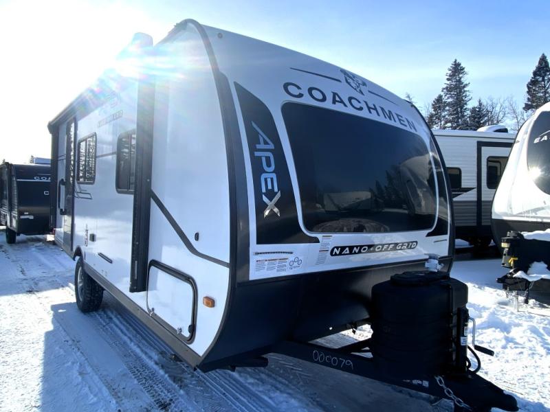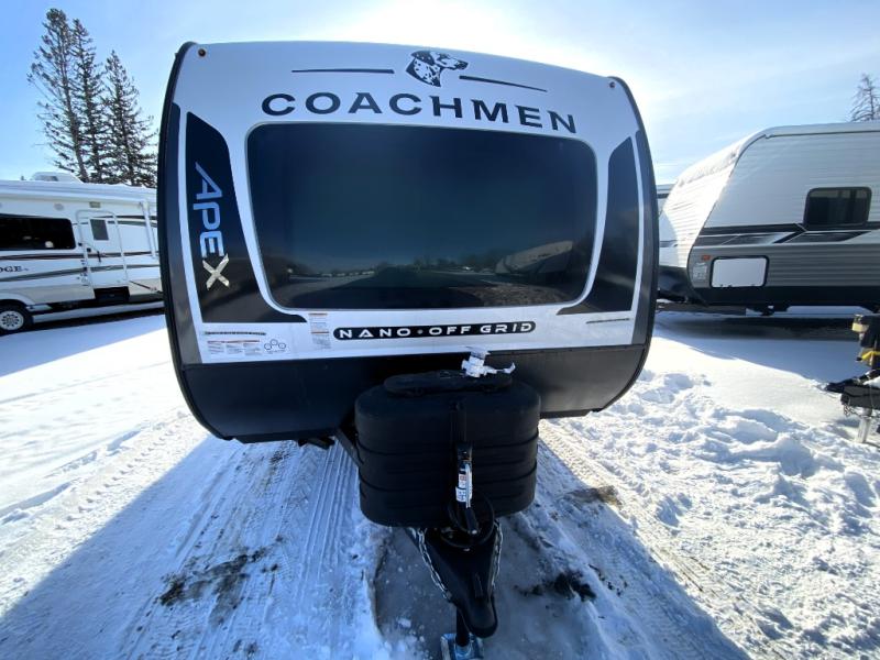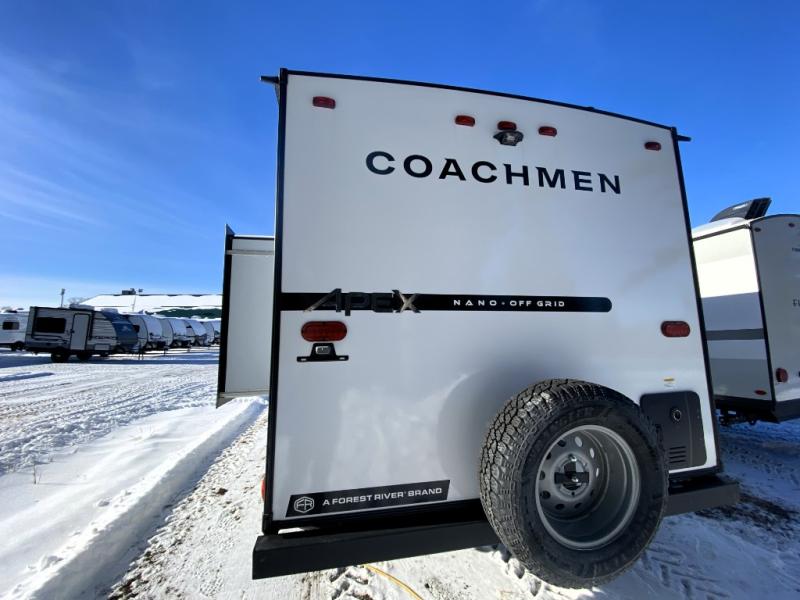 You will find comfort, convenience, and a sturdy construction with each of these Coachmen RV Apex Nano travel trailers! They are held together with an aluma-cage construction, an I-beam chassis, plus vacuum-bonded laminated dual Azdel fiberglass walls for double the protection against the elements. The 400-watt solar panel with a 30 amp control charger is included, along with two 20 lb. LP tanks, a high velocity power roof vent, plus 12V outlets to keep you powered up. More exterior features include a hot/cold shower, four stabilizer jacks, a power awning with LED lighting, and radius thumb latch baggage doors to easily pack and unload your gear. You will love the interior of your Apex Nano with Congoleum residential flooring, one-piece seamless edge countertops, matte black hardware in the galley, and a hand-crafted wood medicine cabinet in the bath.