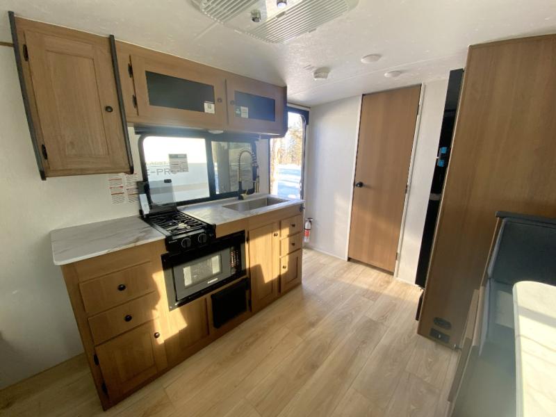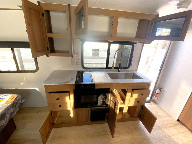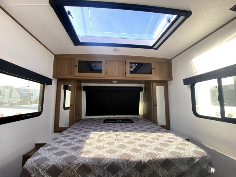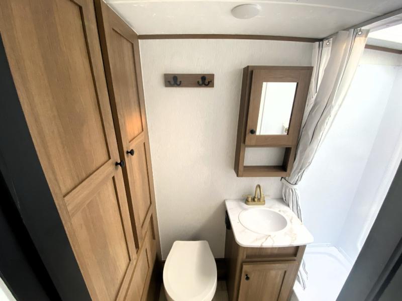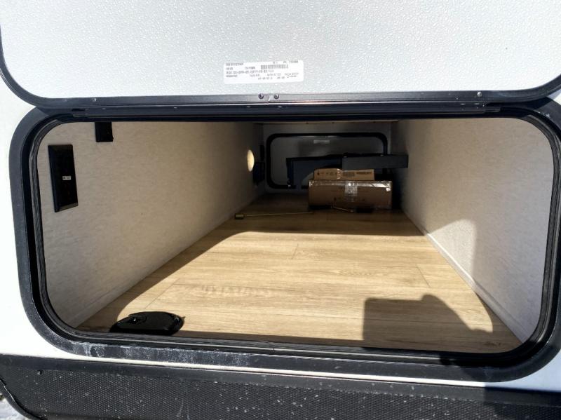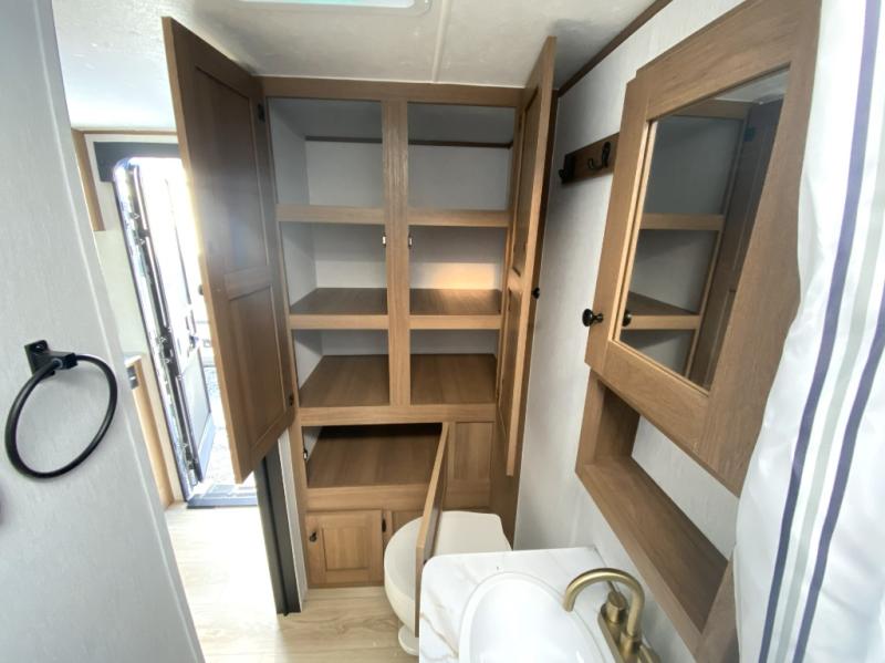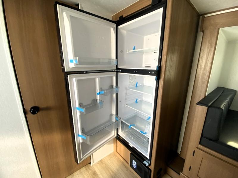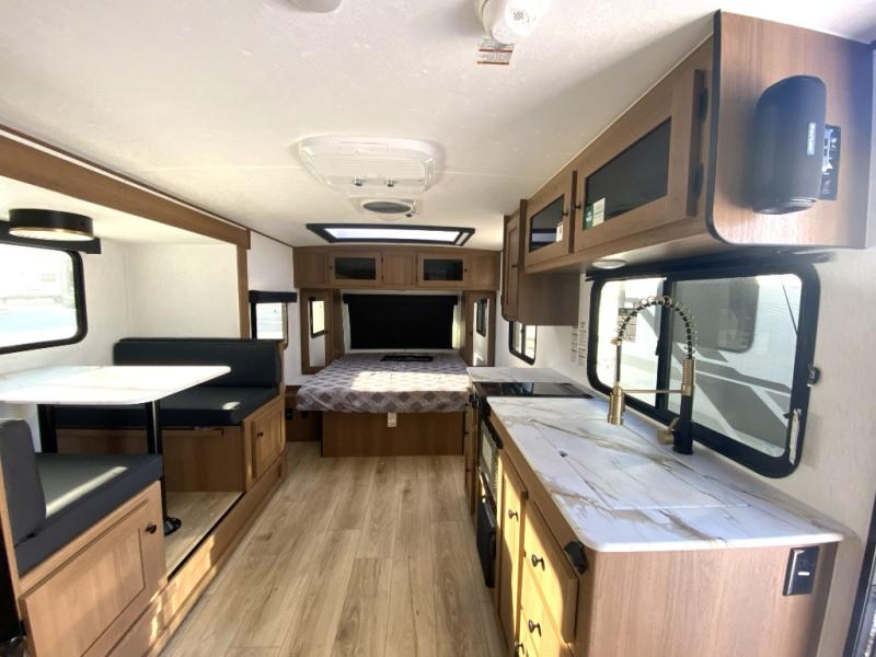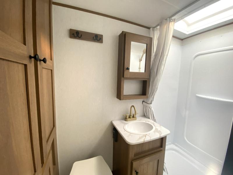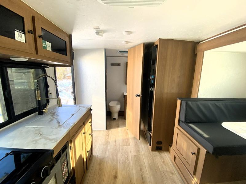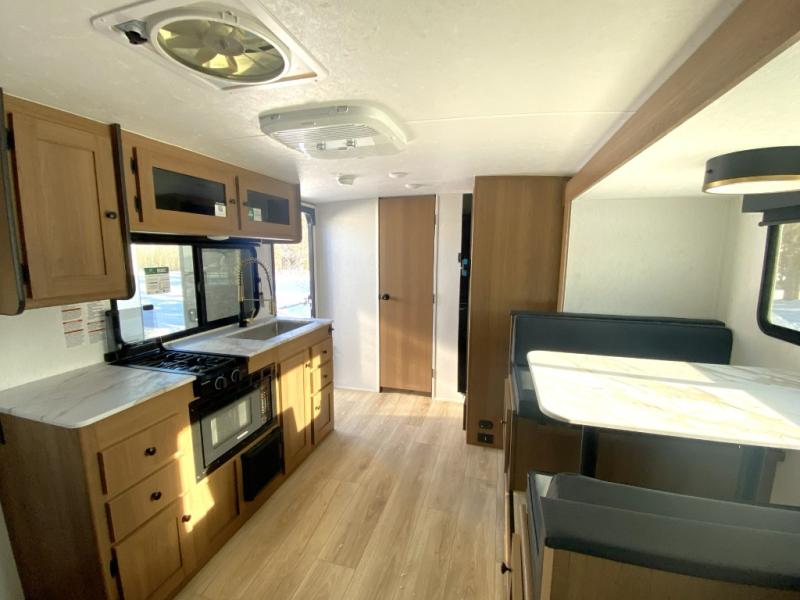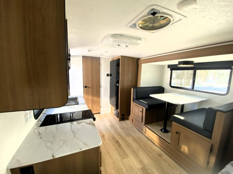 Whether you camp with friends, family or solo, this trailer gives you space for all with a spacious main living and kitchen area thanks to the booth dinette slide! The rear full bath offers a shower, sink, toilet and a wardrobe so you can get ready in privacy. A two-burner cooktop and microwave underneath will let you make meals each day, and the 12V refrigerator will be perfect for perishables. The walk-around queen-size bed provides convenience when getting in and out of bed and there are two wardrobes and overhead cabinets to keep your belongings up and away. The power awning protects you from the elements when relaxing outside, and the exterior pass-through storage gives you a place to stow the outdoor equipment like camping chairs, tables, fishing poles and charcoal.