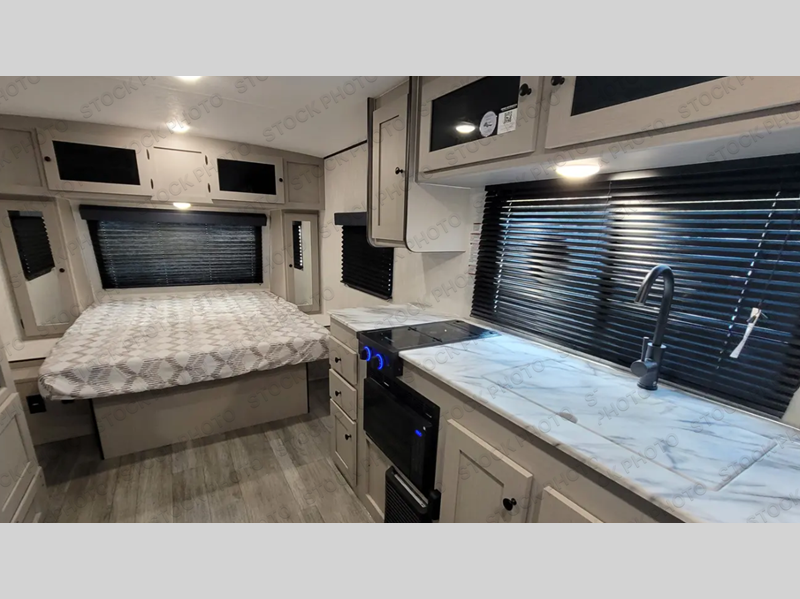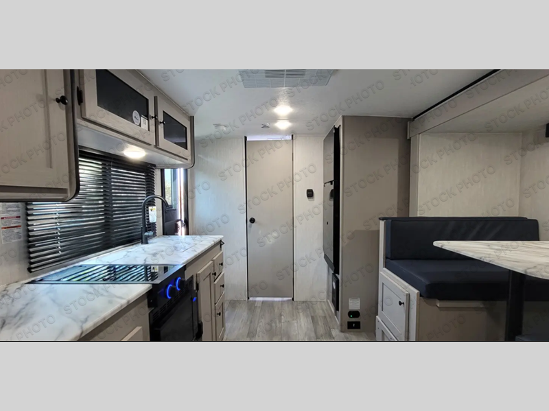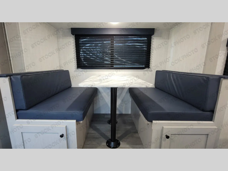 Whether you camp with friends, family or solo, this trailer gives you space for all with a spacious main living and kitchen area thanks to the booth dinette slide! The rear full bath offers a shower, sink, toilet and a wardrobe so you can get ready in privacy. A two burner cooktop and microwave underneath will let you make meals each day, and the 12V refrigerator will be perfect for perishables. The walk-around queen-size bed provides convenience when getting in and out of bed and there are two wardrobes and overhead cabinets to keep your belongings up and away. The power awning protects you from the elements when relaxing outside, and the exterior pass-through storage gives you a place to stow the outdoor equipment like camping chairs, tables, fishing poles and charcoal.